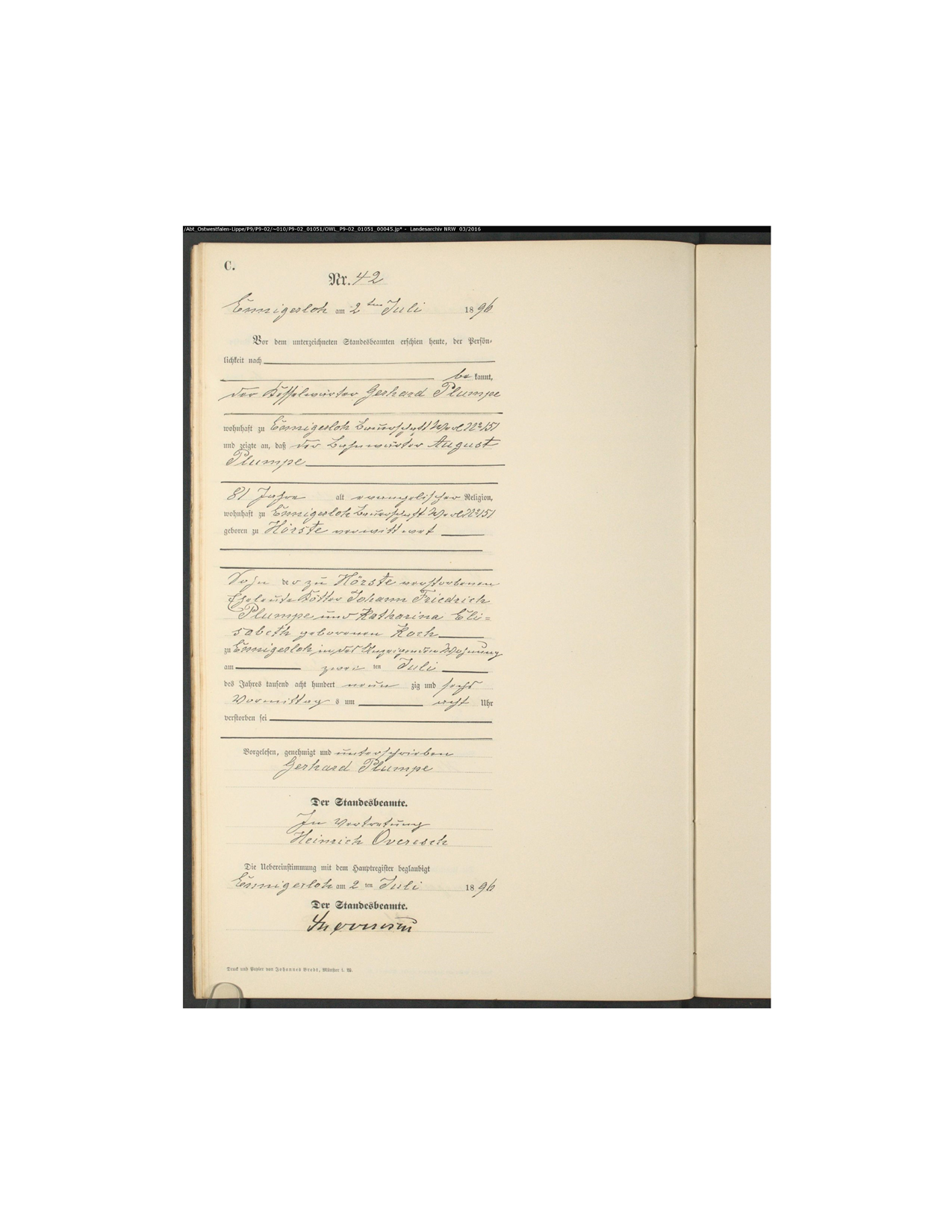Ennigerloh, on the 2nd of July 1896.Before the undersigned civil registrar appeared today the boilerman/stoker Gerhard Plumpe, personally known, residing in Ennigerloh, Bauerschaft Werl no. 151, and reported that the railway signalman August Plumpe, 81 years old, Protestant religion, residing in Ennigerloh, Bauerschaft Werl no. 151, born in Hörste, widowed, son of the deceased at Hörste married couple cottager Johann Friedrich Plumpe and Katharina Elisabeth, née Koch, died at Ennigerloh in the informant's residence on the 2nd of July of the year 1896 in the morning at 8:00 am.