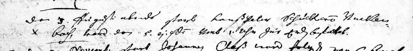 On the 3rd of August [1672] in the evening Hanss Peter Schuck? from Unkenbach died and on the 5th of the same month at 1 o'clock was buried to the earth.