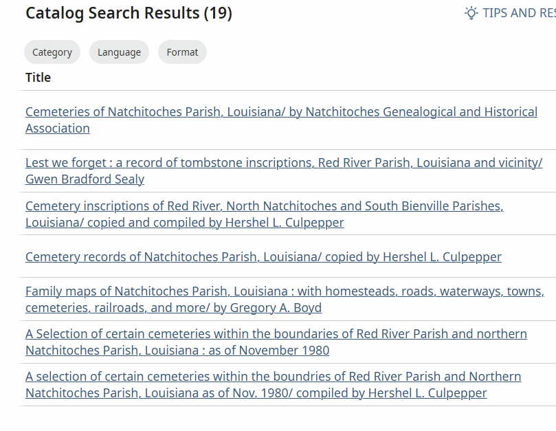 Multiple books covering Natchitoches Parish cemeteries are listed in the FS Catalog.