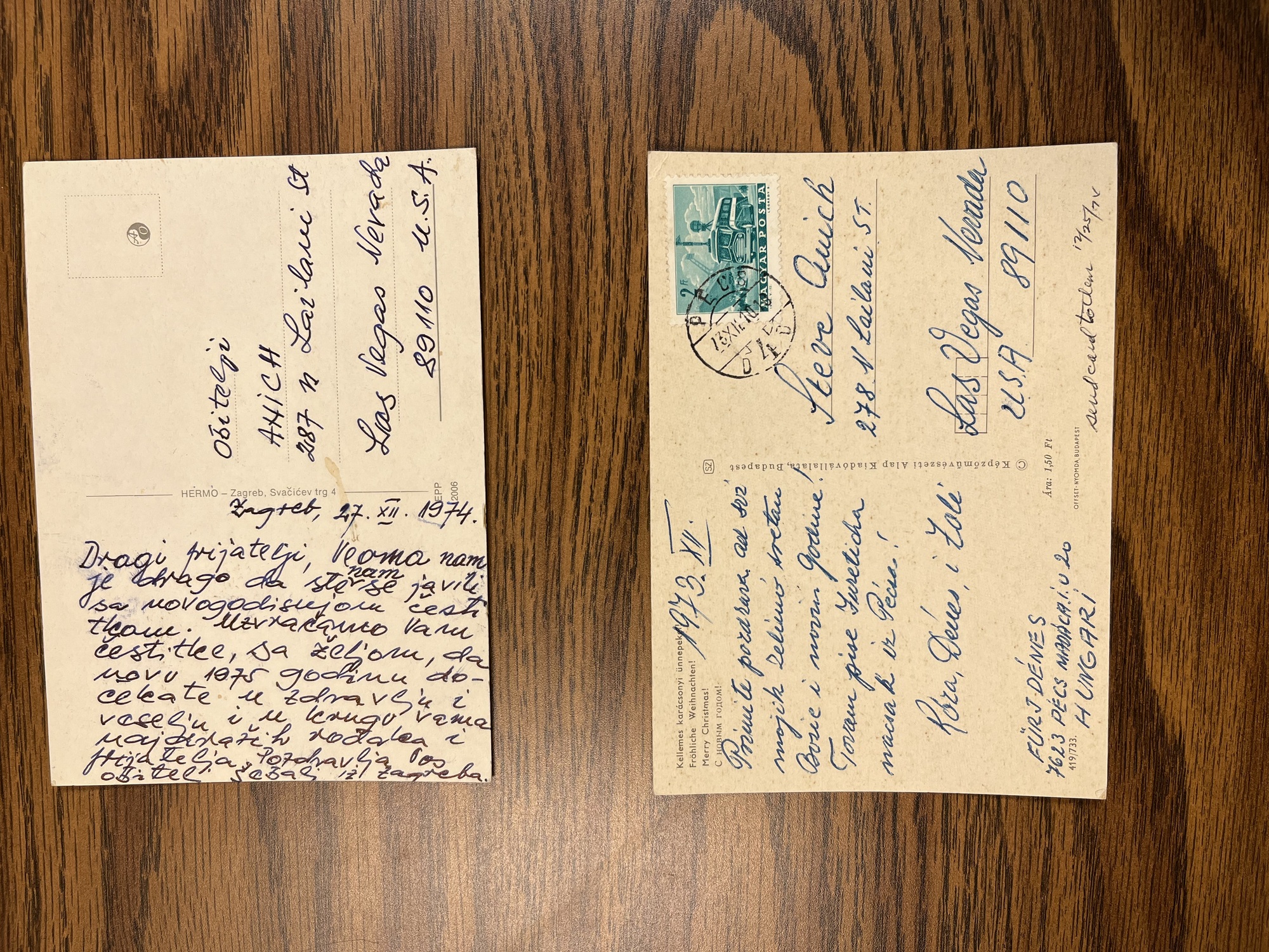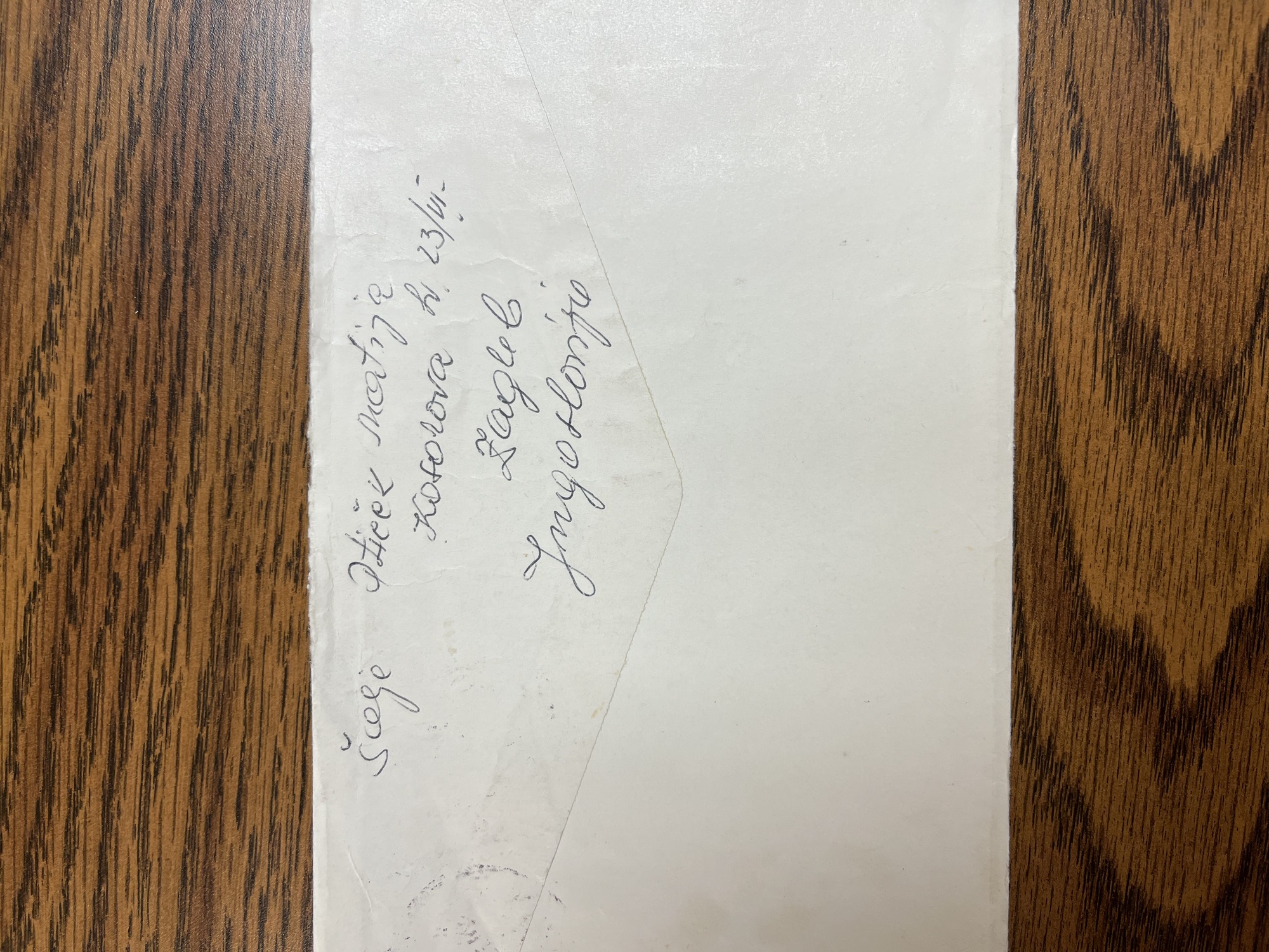 I am attaching two post cards, one envelope, and one envelope and letter that I need help with being translated. These were with my mother's things. They were sent to my grandparents. My ancestors came to the United States from Croatia/Yugoslavia/Checkoslovakia in the1800s I believe. Some US Census information says Hungary, some says Croatia, and some says Austria.
