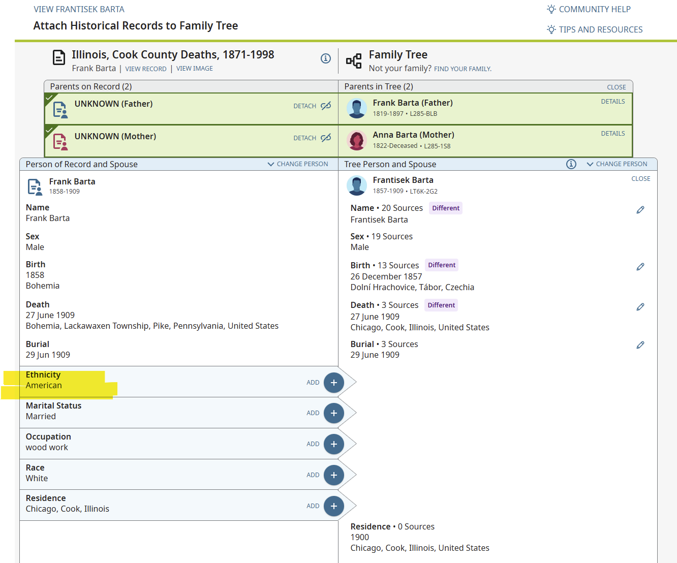More than a year later, and that annoying ethnicity thing is still present. I detached the death record from LT6K-2G2 to test.