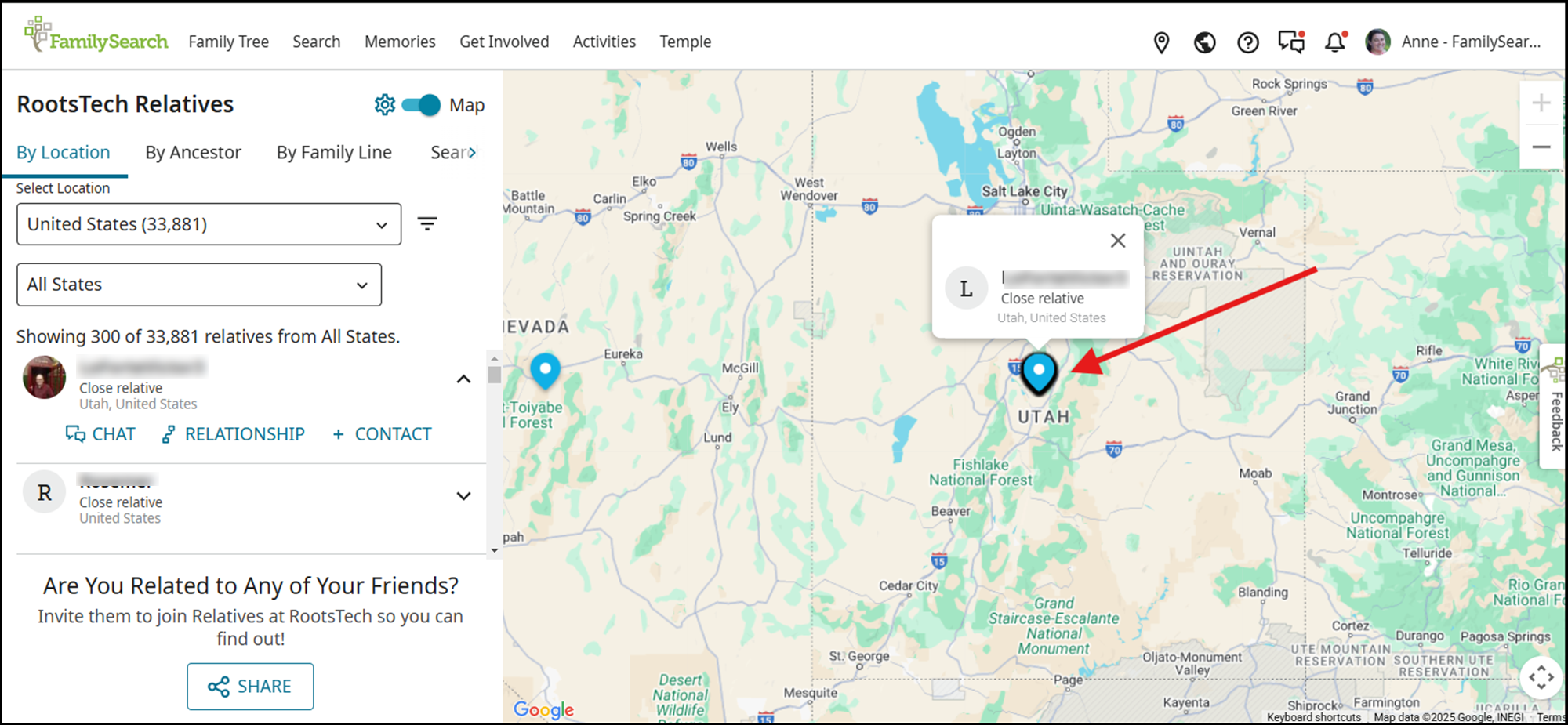 Remember, these cousins are only registered to the state level. It doesn't show a specific town for anyone. Watch for a number of cousins near Kansas City. Anyone that only registered to the United States, a country level (see Kyle and Rosemer in the above picture) show up in the middle of the country. For the United States the middle of the country is near Kansas City.