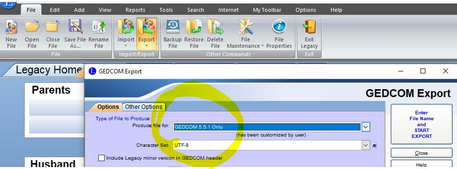 I exported my GEDCOM from Legacy Family Tree 10 using their "GEDCOM 5.5.1 Only" (see attached image). The GEDCOM seems to have exported correctly but none of the marriages seem to have been uploaded into my CET. I deleted that CET and re-uploaded using Legacy's generic GEDCOM without any noted marriage problems.