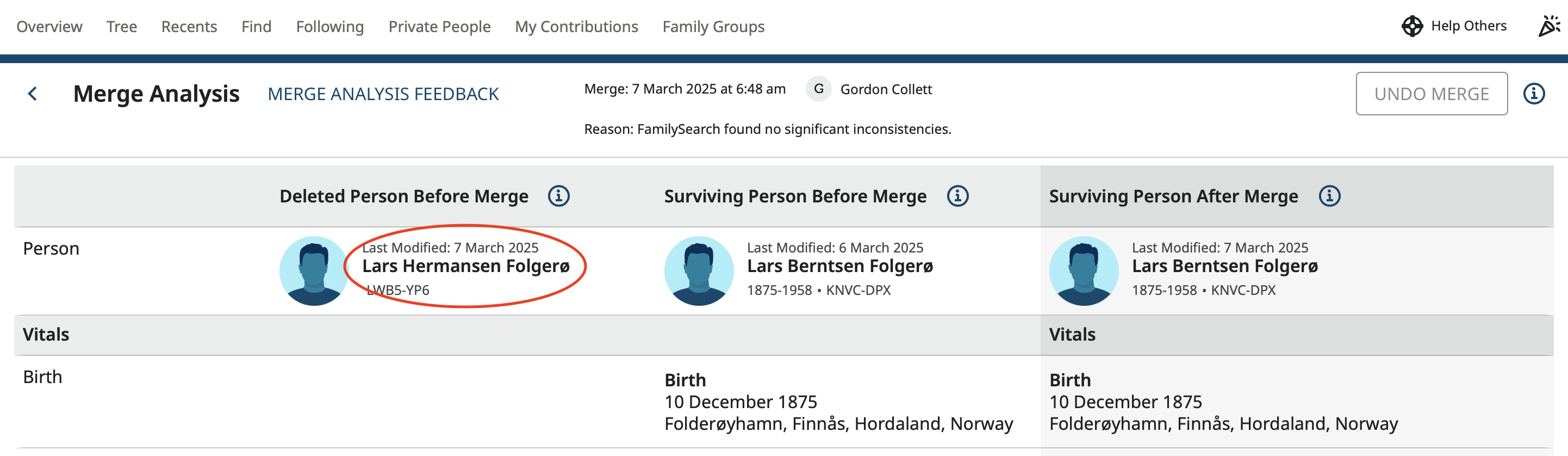 Today at RootsTech I found an incorrect merge on my husband's tree. The merge was made in 2022, so I was not able to undo it, but the change log clearly showed which records had been added with the incorrect merge. I was able to contact the person who made the merge with clarifying details, and he immediately agreed to correct the merge. This was a great success.