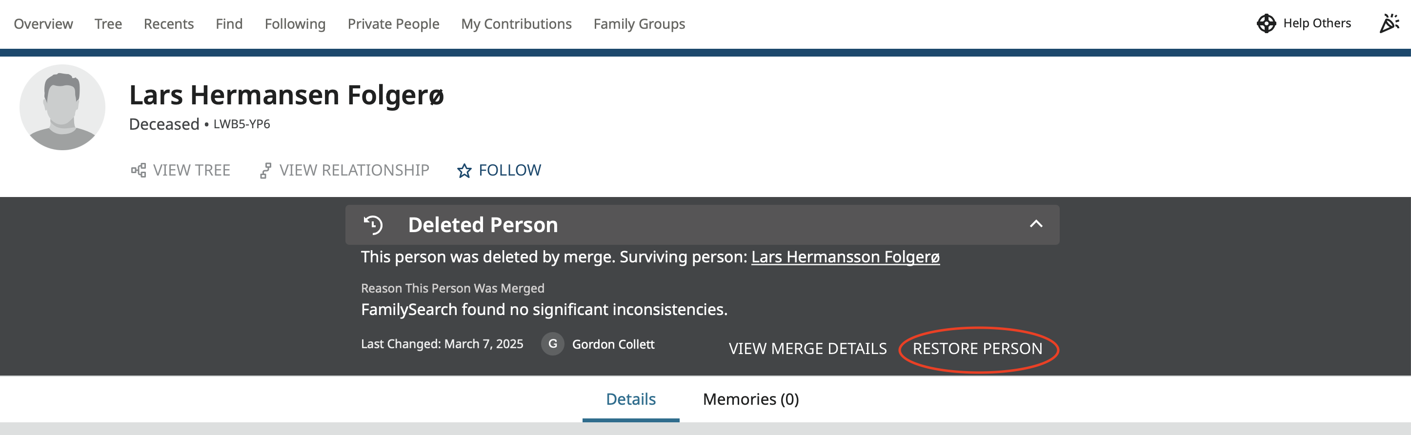 Starting from the Merge Analysis view, click on the name of the deleted person: