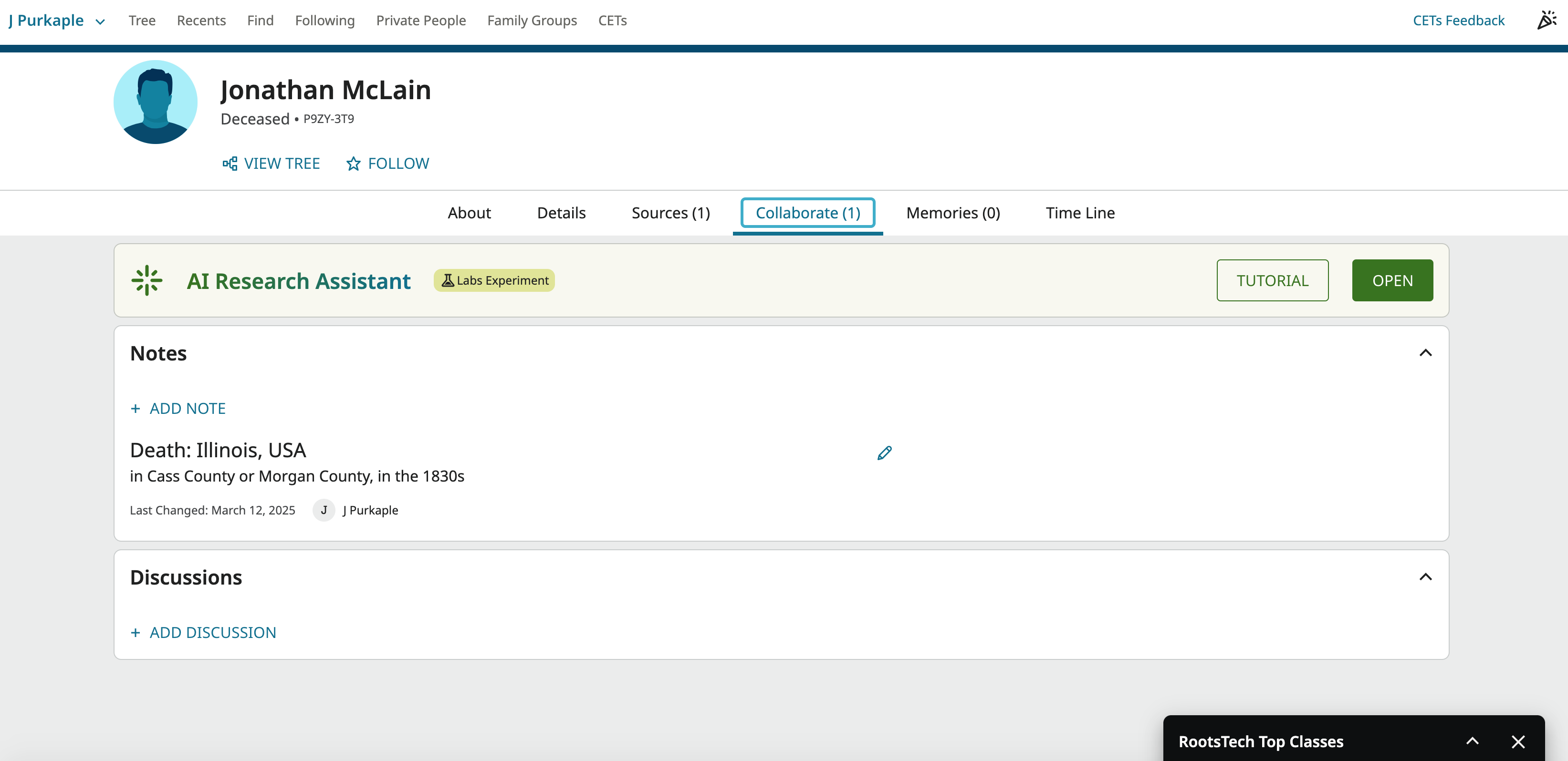 Ancestry events/facts don't just have date and location, but also description/notes. It seems these were not carried into CET from Ancestry at all. One example was my ancestor Jonathan McLain (Johnathan McClane) who died in one of 2 counties in Illinois in the 1830s. The location on his death (just Illinois) carried over correctly, but the description on that death event from Ancestry (mentioning the 2 county possibilities & giving an approximate span of years) is nowhere to be found in the CET upload. Many people in my main personal Ancestry tree (over 8100 people) have at least one fact with notes in the description, which is a big problem going forward if those don't carry over into CET uploads.