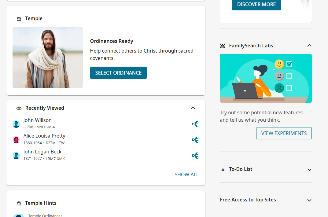 Yes, I live Finland and I don't use VPN. Thank you Gordon for your Screenshots, because now I can show what we used to have couple weeks ago, but now they are missing. I am a Senior Service Missionary for FamilySearch Support here in Finland (Nordic and Baltic team) and I am getting many messages from Finnish people asking where these features like To Do list have gone from the Home page.