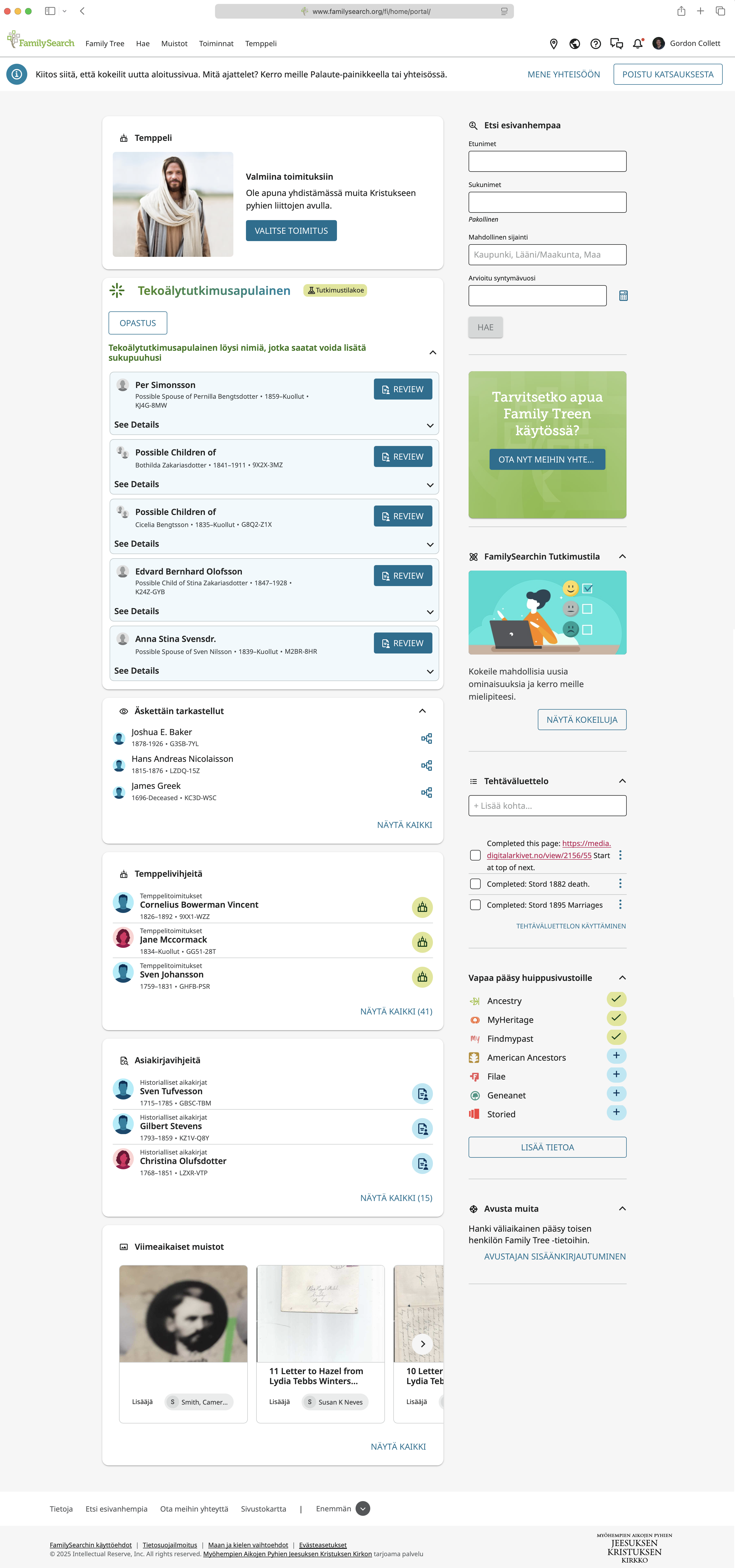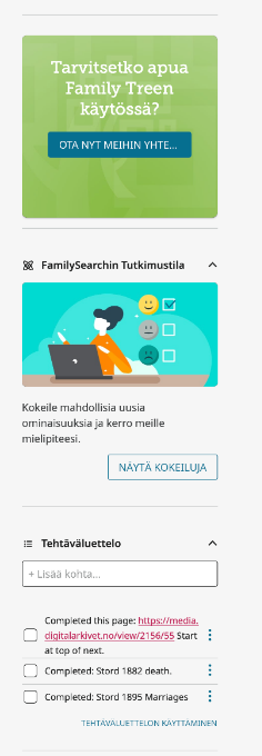 @Alan E. Brown , so @Heidi Kuosmanen should be able to see the full Finnish home page if she can determine the proper URL to use. Which still begs the question of why members in Finland with extensive experience in FamilySearch are only presented with the partial Finnish home page when signing into FamilySearch from Finland no matter whether they set the page to Finnish or English. Is this a glitch in this new release for them? Heidi, what URL do you see for your home page when you are signed in?