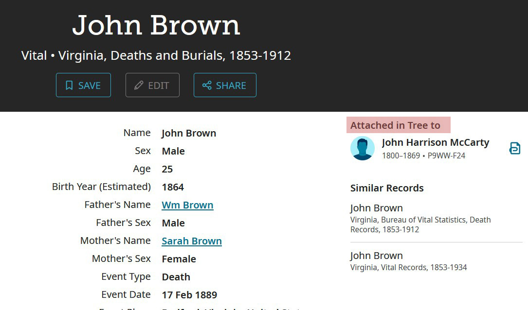 @Mark McKenzie_1 You should never be told that the record person is "Attached in Tree To:" any PID outside of the tree you searched from. Ex. If I search records from Howard in my CET, I should never be informed that the identified records is attached to Howard in your CETs, or the Shared Family Tree.