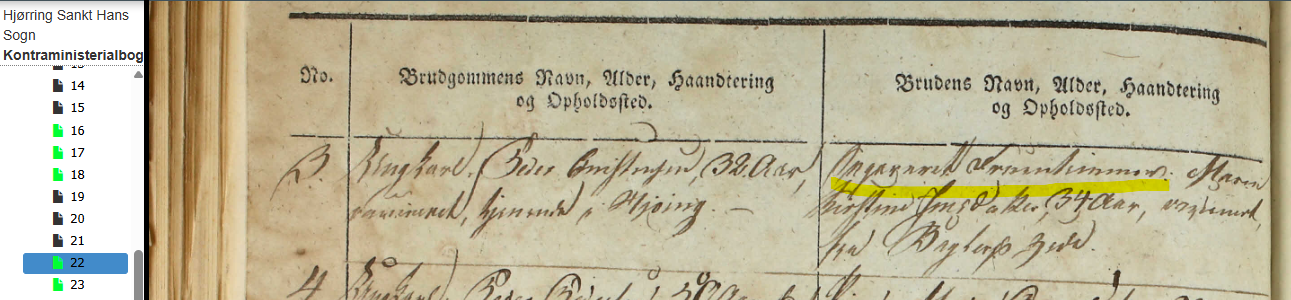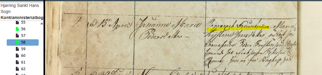 I am helping a friend resolve some problems on her tree. Please see Maren Kirstine Jensdatter #K2TG-JN4 - the attached 1834 census has a different spouse, Peder Christensen (currently incorrectly linked to her husband Ole Pedersen) I found that couple on the tree elsewhere (see Maren Kirstine Jensdatter #MJXZ-7LH) It looks like she needs to merge the two women. I am still working on verifiying all the children for the second couple - I suspect there is some incorrect data there with a mother named simply Maren, not Maren Kirstine…. anyway in an effort to find images of sources, I have found the birth record for Johanne Marie Pedersdatter born in 1832 at Hjorring Sankt Hans, Hjorring and the later marriage of Maren Kirstine and the father of Johanne Marie (Peder Christensen) which was in Jan 1833 at Sankt Hans. I am attaching images of three different records - the marriage and two illeg. children of Maren Kirstine Jensdatter. All have terms before her name, or as part of her description that I cannot read - She is not a widow and also not living with her first husband, Ole Pedersen. The first is the christening of her daughter Helene. (Why would she be considered illeg. ? )