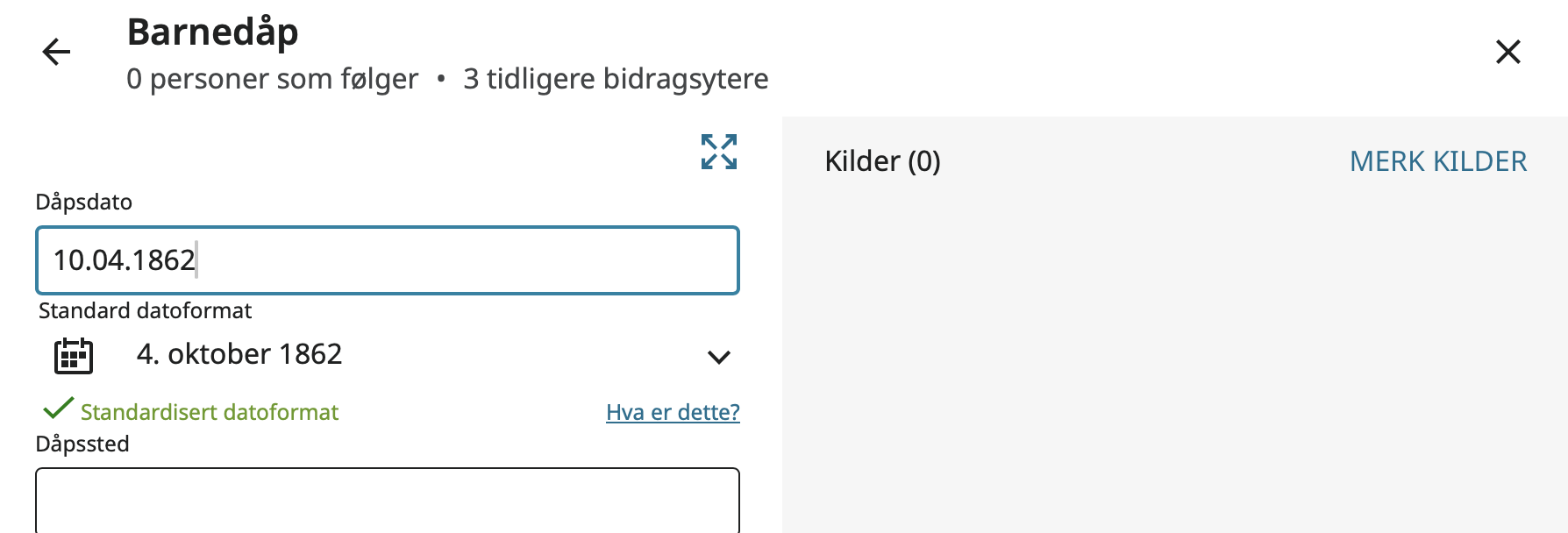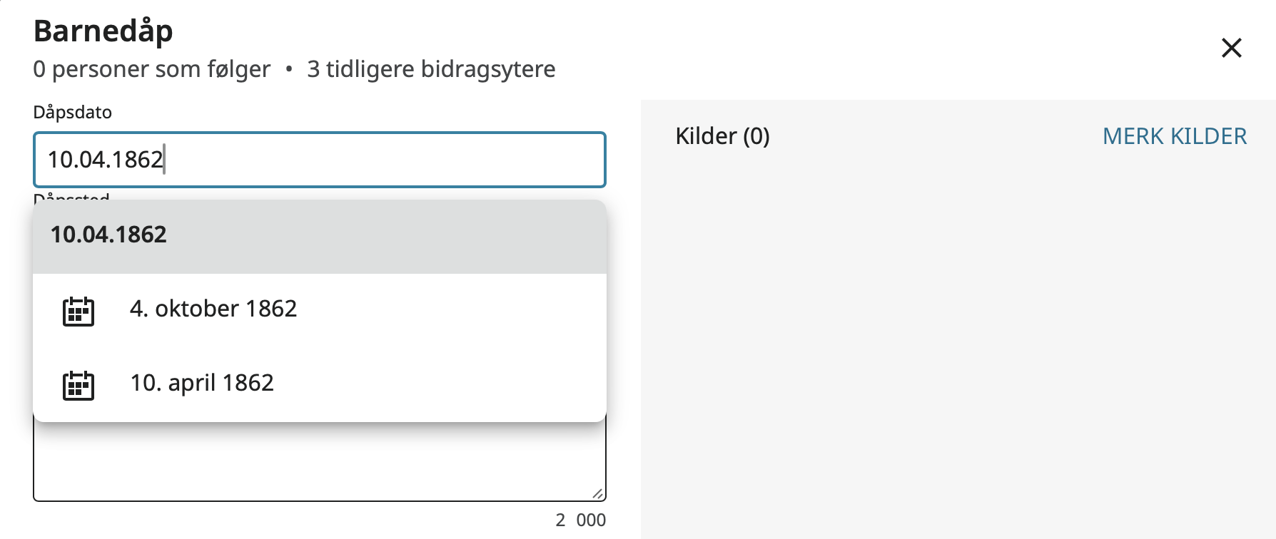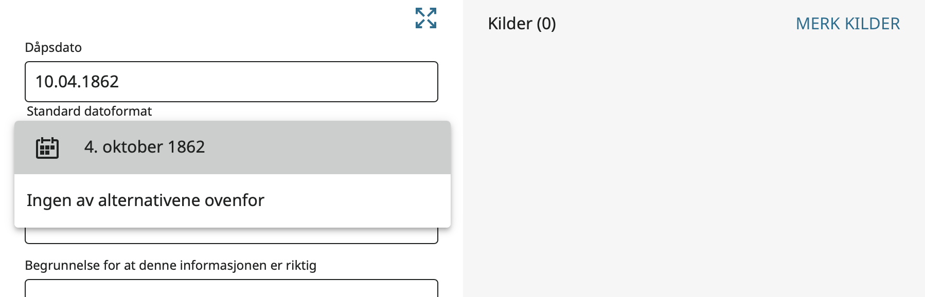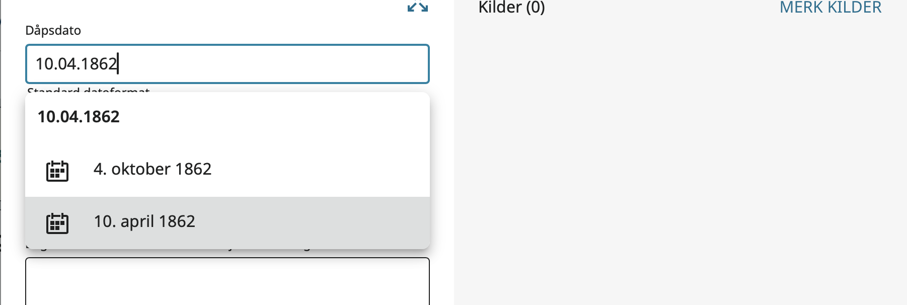 If you insist on keeping the ambiguous number only version, you can. Just click on the top line that has that form. But be very careful if you do! The program will take the first listed standard of 4. okt 1862. It has to pick one of them to know what the date is: