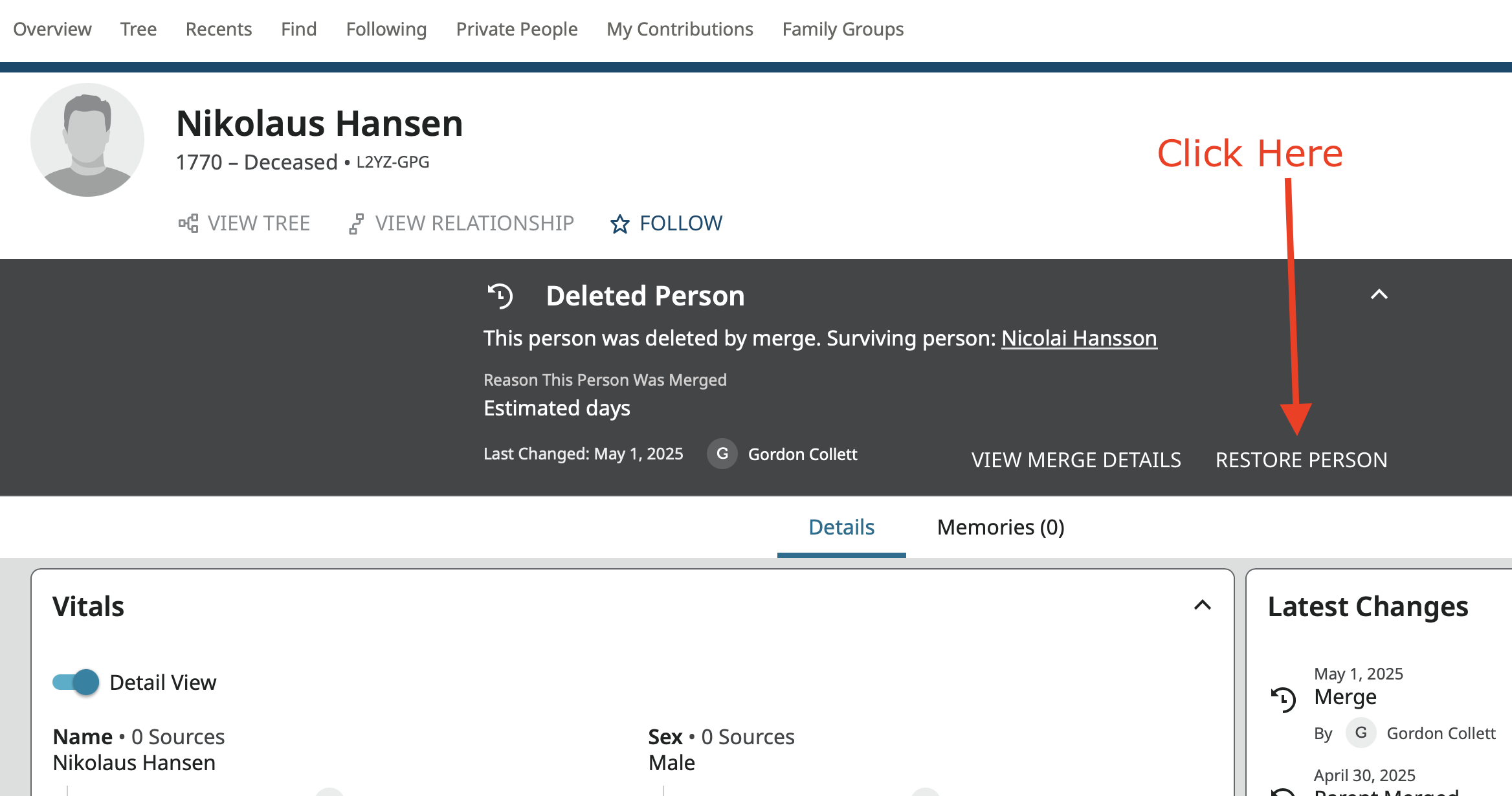 @DWGreen You restore that merge the same way you always restored a merge when editing prevented a simple undo. Go to the deleted person's profile page which you can get to through the change log of the surviving person, and click Restore: