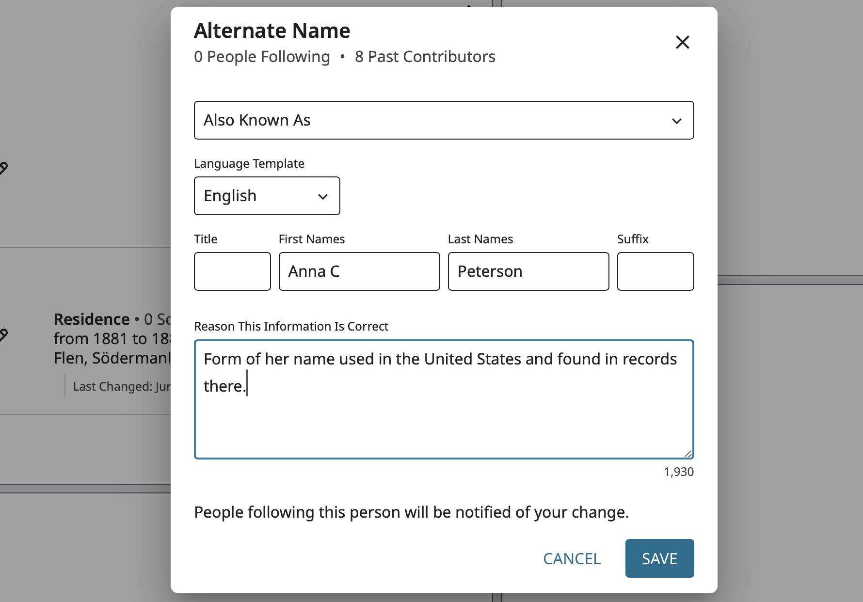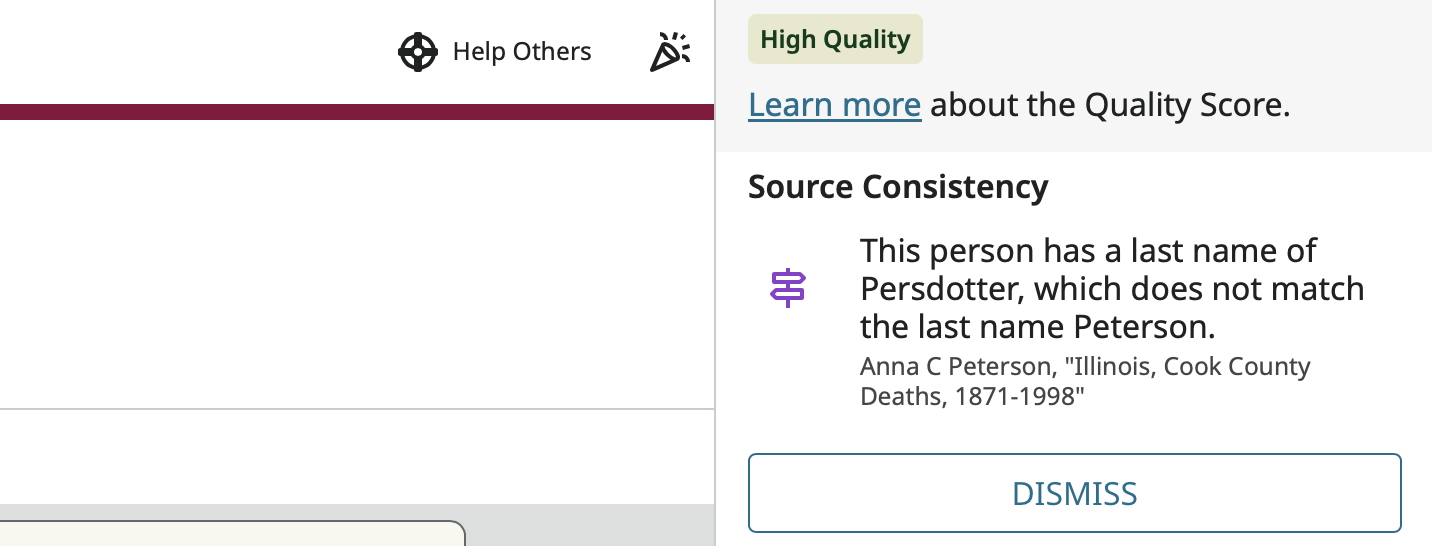 It states there is a conflict because some records show her last name as Persdotter and some show Peterson. Her father when by Per or Pehr, but his birth and christening record show Peter. I'm not sure where to put this information to make it clear and fix the conflict!