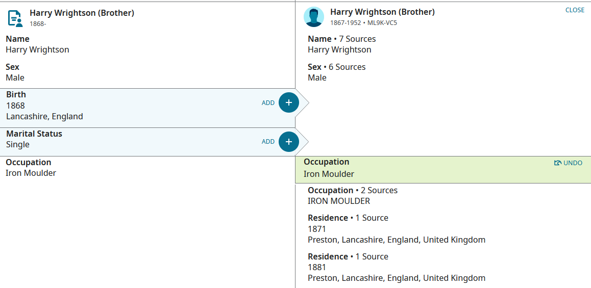 It would not be possible to carry across the occupation "IRON MOULDER" if it had appeared in that form when attaching a previous (1881) census source, but because it appears as "Iron Moulder" in the 1891 source, it can be moved across. In these days of AI, and other advanced programming, surely these "different" occupations be recognised as being exactly the same?