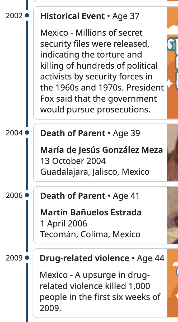 While I appreciate the effort to give context to our ancestors’ lives, I was really disappointed to see that my brother’s timeline included events like drug violence, secret political killings, and corruption in Mexico. These types of entries don’t reflect the full picture of the country or its people—and honestly, they feel one-sided and discouraging.