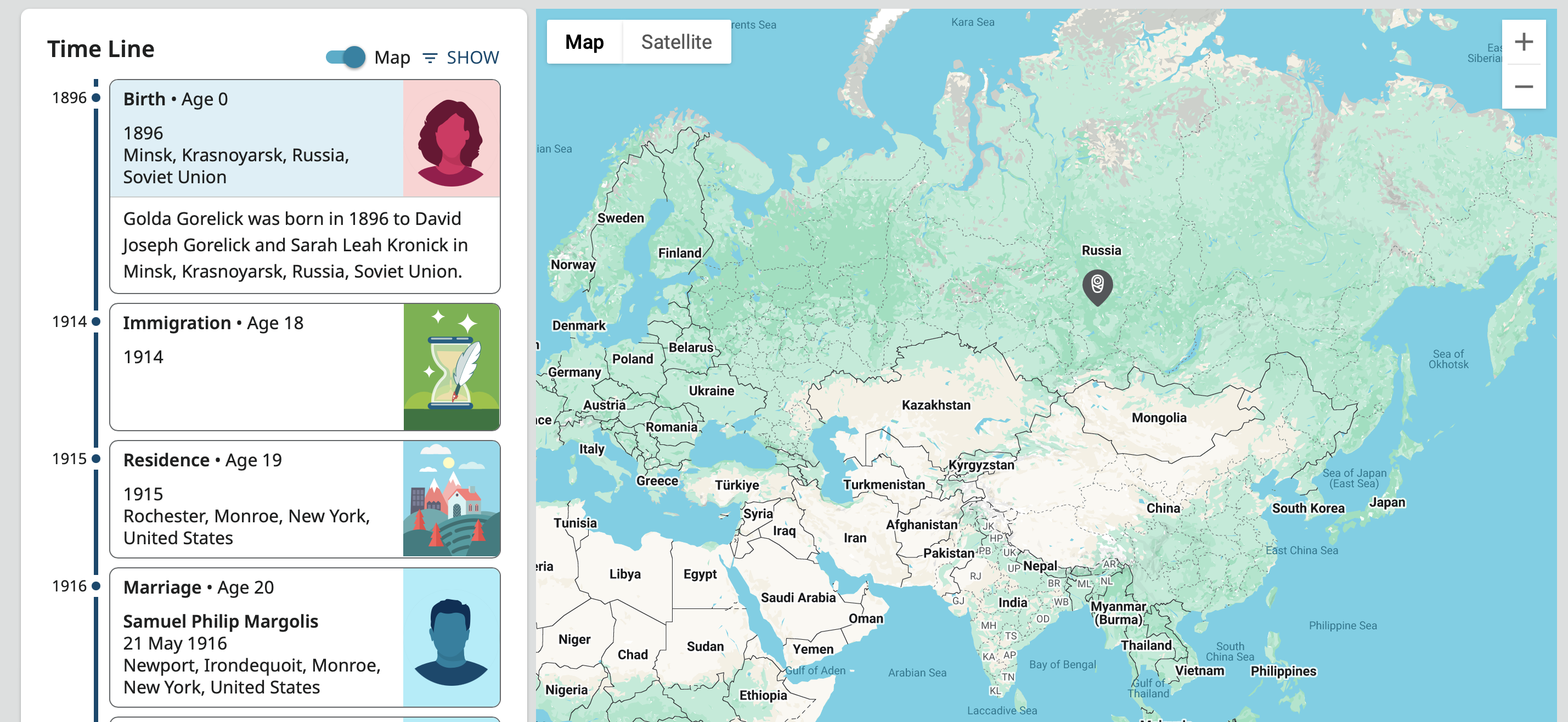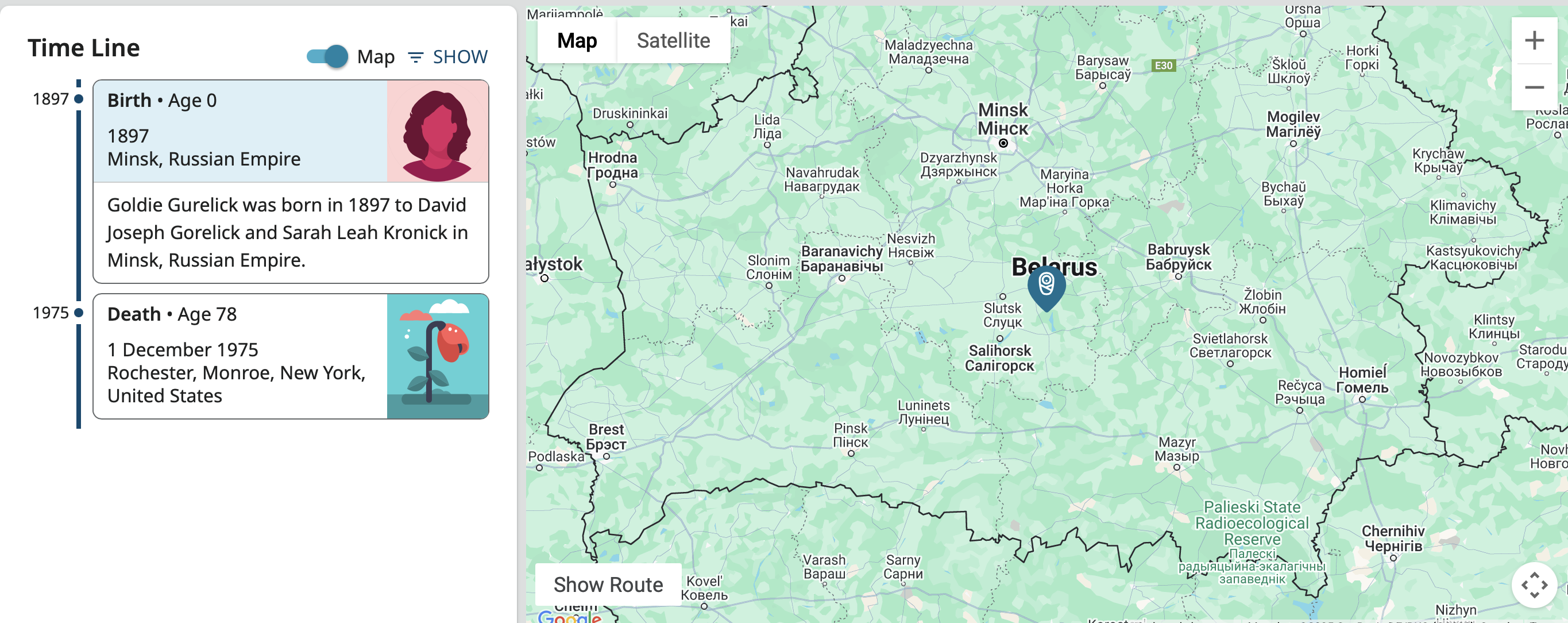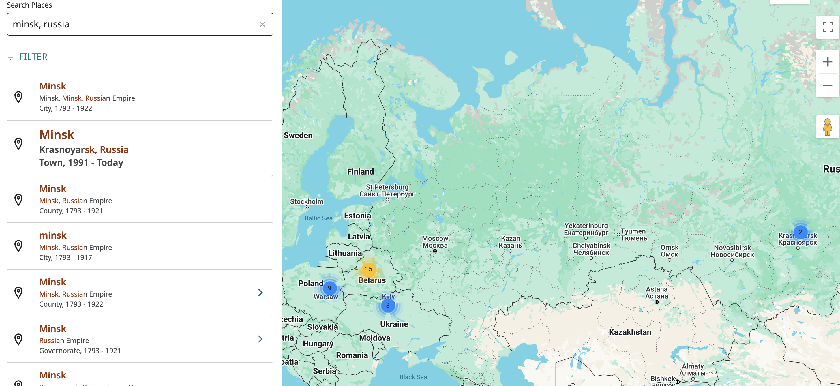 For Goldie https://www.familysearch.org/en/tree/person/details/L2X8-8PB whose birth place was also listed as Minsk, Russia, I had to temporarily restore her to see what the underlying linked standard. In this case, it is Minsk, Russian Empire which plots here: