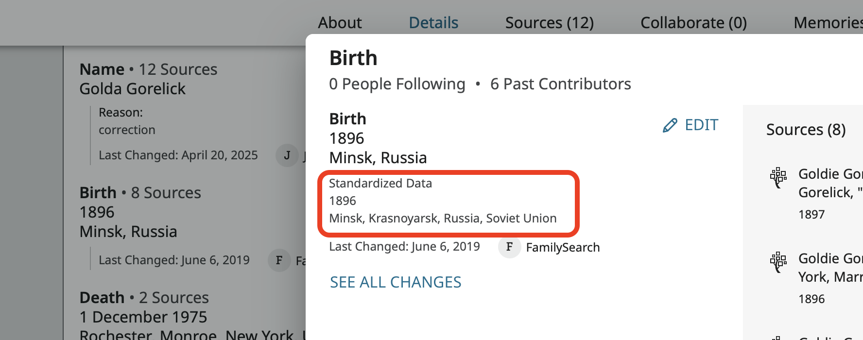 The data comparison routines for place names occasionally are pointing out errors in standardization or actual errors in the Places database. One easy way to check for these is to look at the timeline map because it is the standard linked to the place name that shows on the map. Looking at Golda https://www.familysearch.org/en/tree/person/timeline/L6H9-R1L you can see that her birth place of Minsk, Russia, is linked and plots on the map to the standard "Minsk, Krasnoyarsk, Russia, Soviet Union." (The Soviet Union was not created until 1922 so this is the wrong standard for her birth place.)