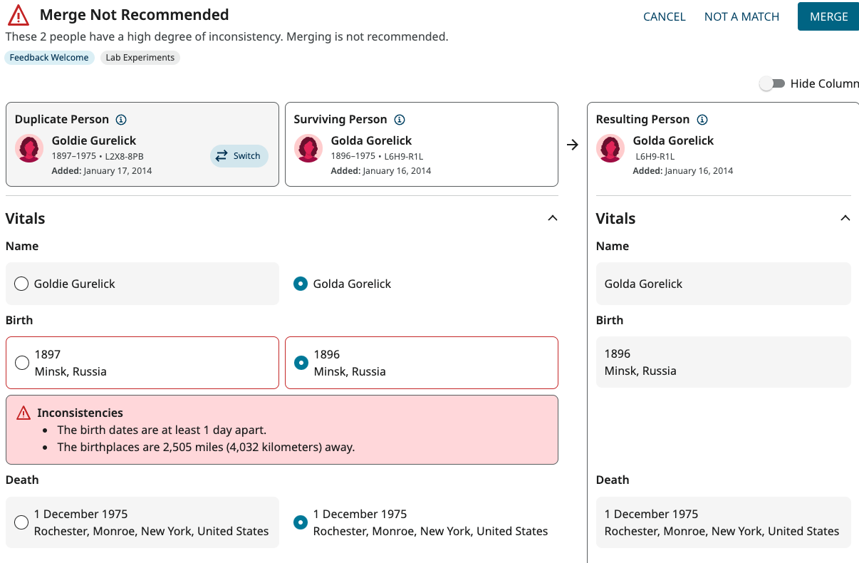 @Soccer Mom Most places in Family Search use fuzzy matching and a database of name spelling variants when comparing names. We users, years and years ago, used to have access to the variant database for first names and last names and see how they were grouped. For example Thomas, Tomas, Tom, and every other way you could possibly spell these would be in one entry. Some of these groups were pretty lengthy. Gurelick and Gorelick certainly look like just minor spelling variant that would be considered the same name. You must agree or you would not be merging these two.