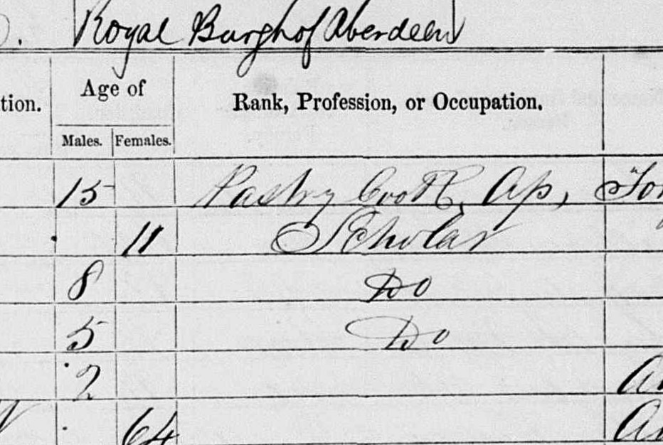 I am hoping someone can help me with a single word from this 1861 Scotland Aberdeen Census. My great grandfather was a candy maker, confectioner and pastry cook in Scotland. He is the first entry in this document. I can’t figure out the second word. "Pastry, ?, Apprentice." Ancestry says it is "cook" but that doesn't look right to me. Any ideas?