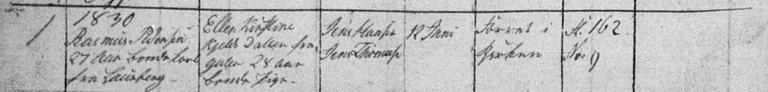 I'm researching Rasmus Pedersen who was born around 1803, married 12 June 1830 in Gullev, and died 10 April 1838 in Gullev. Based on the marriage record and death record, I think he was born in a village called something like Lamsberg. Can you look at marriage and death record and advise what is name of village?