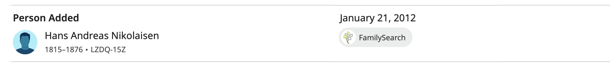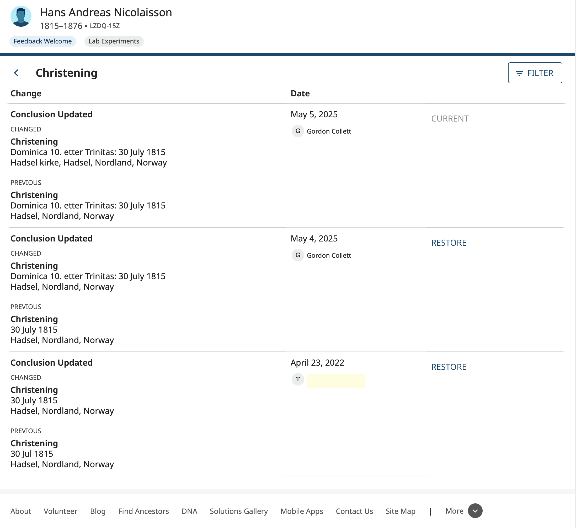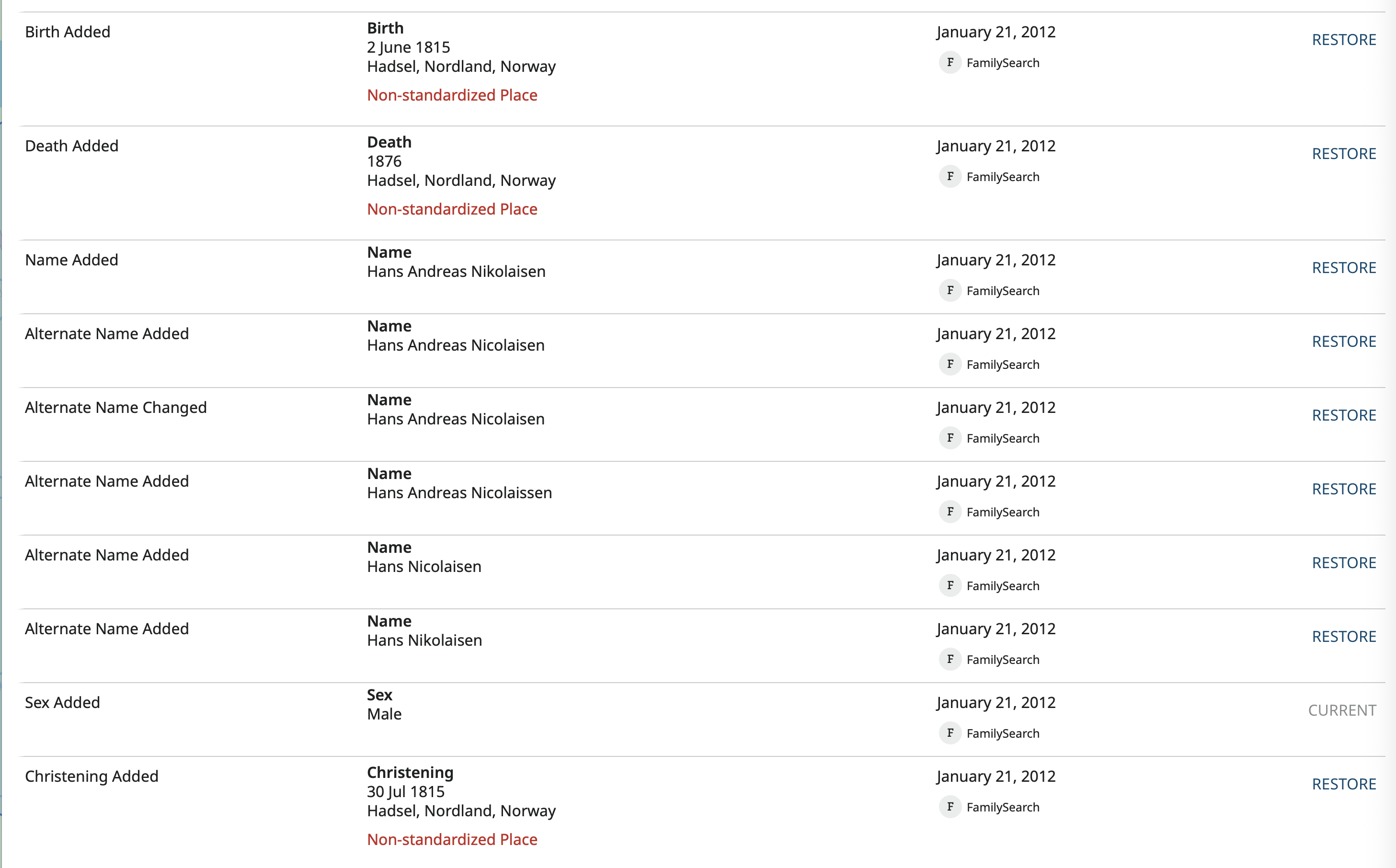The one exception where the restore button is missing is against any value entered when the profile was first created. Notice that the last line in the image are a christening of 30 Jul 1815, Hadsel, Nordland, Norway. There are no earlier christening entries and no way to restore that very first value. This is because the designers have chosen to collapse the creation of the profile into a single line in the change log:
