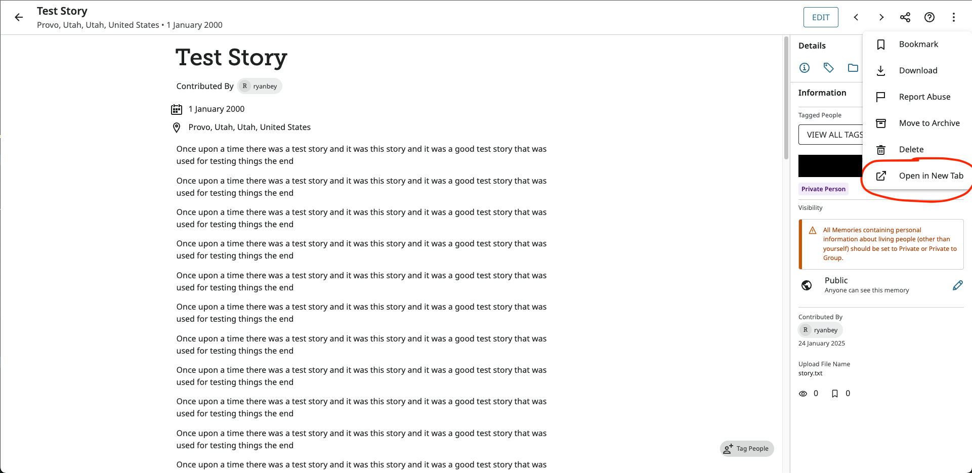 You can open a memory in a new tab after opening the individual memory overlay. See screenshot.