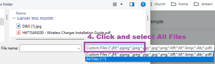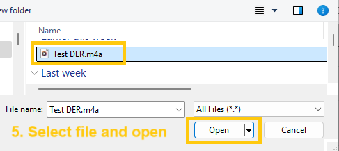 I suggest opening up the drag/drop to include audio types such as mp3 and m4a, and adding these to the Custom Files filter on the dialog that comes up after step 3. Then step 4 will be unnecessary.