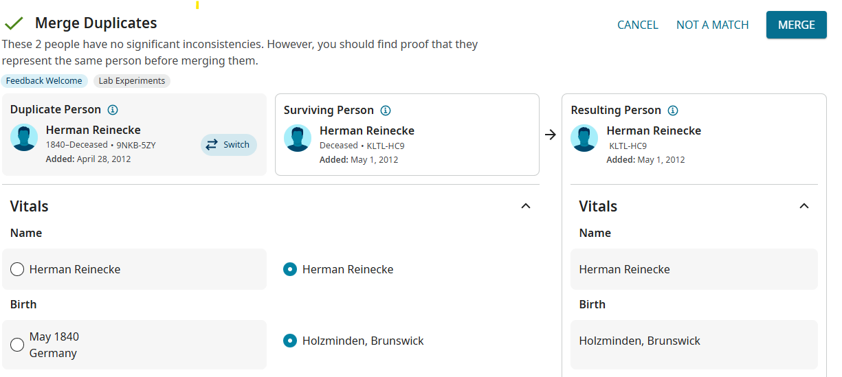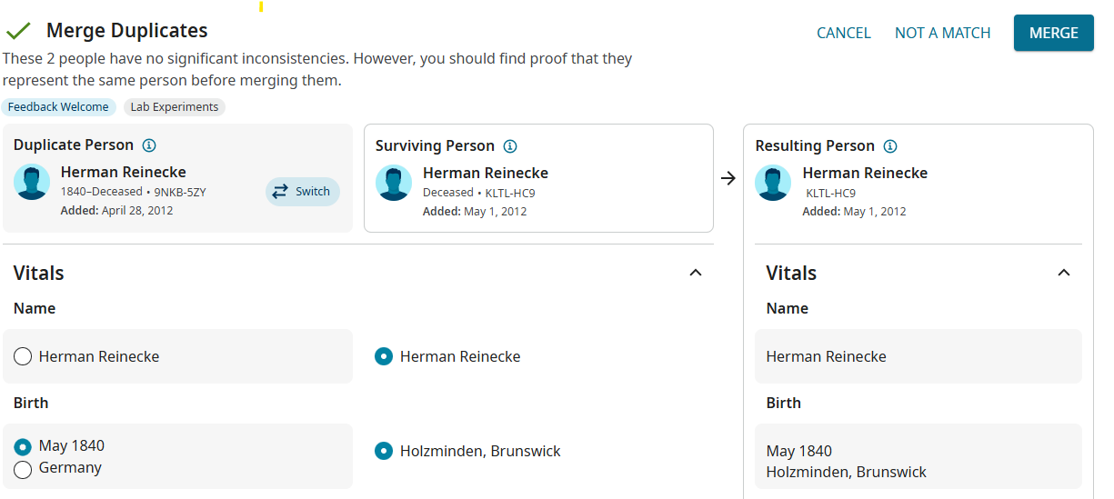 Looking at the example of Herman Reinecke, what we need to end up with in the Birth section is a Date of 'May 1840' and a place of 'Holzminden, Brunswick, Germany' which is a standardised place. The merge facility does not allow this to happen and as had been said you have to go back into the merged record to amend this. You would also have had to make a note of the change you want to make to the merged record as the May 1840 date no longer appears on the merged record. Far better to correct things in one place as you find them.