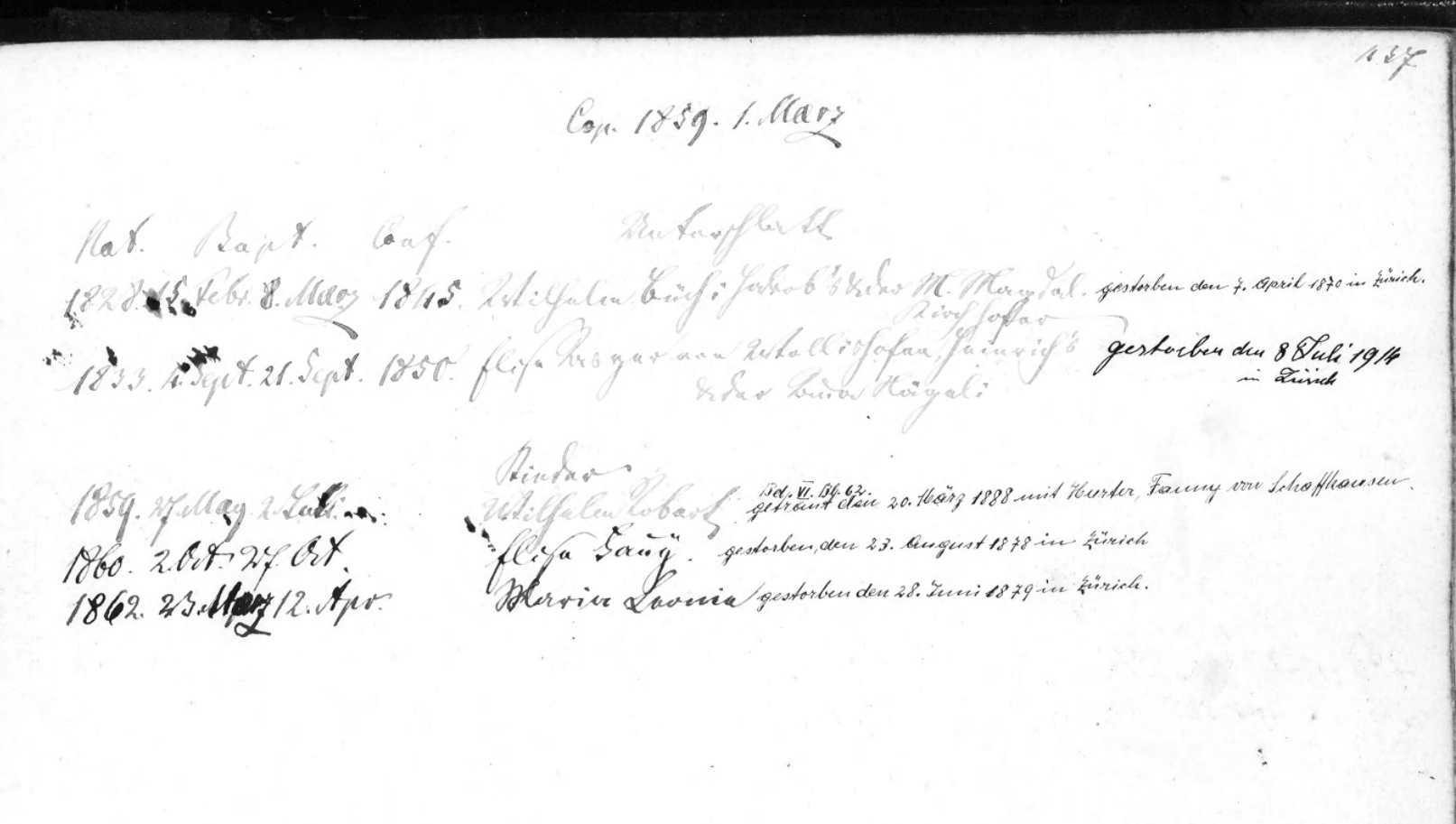 1860.2.Oct ... 27.Oct ... Elisa Fanny, gestorben den 23. August 1878 in Zürich