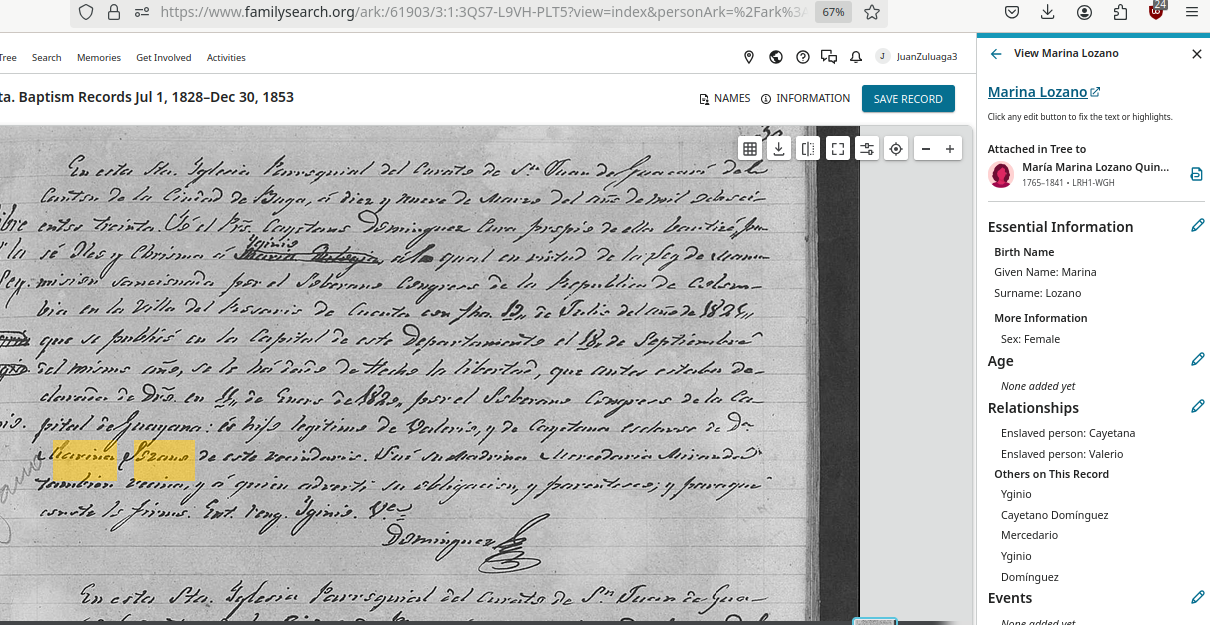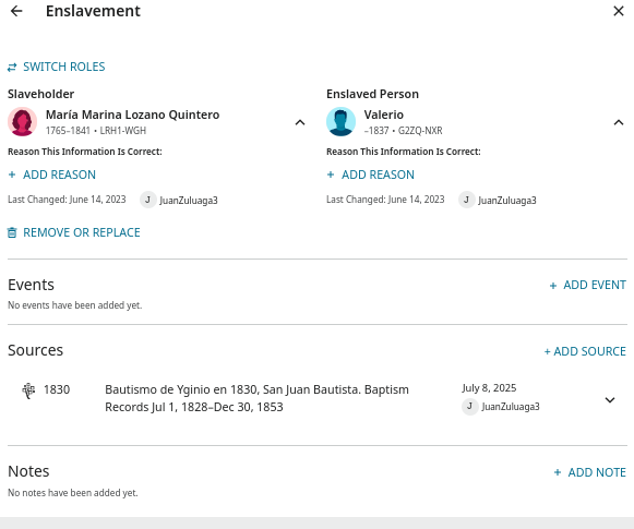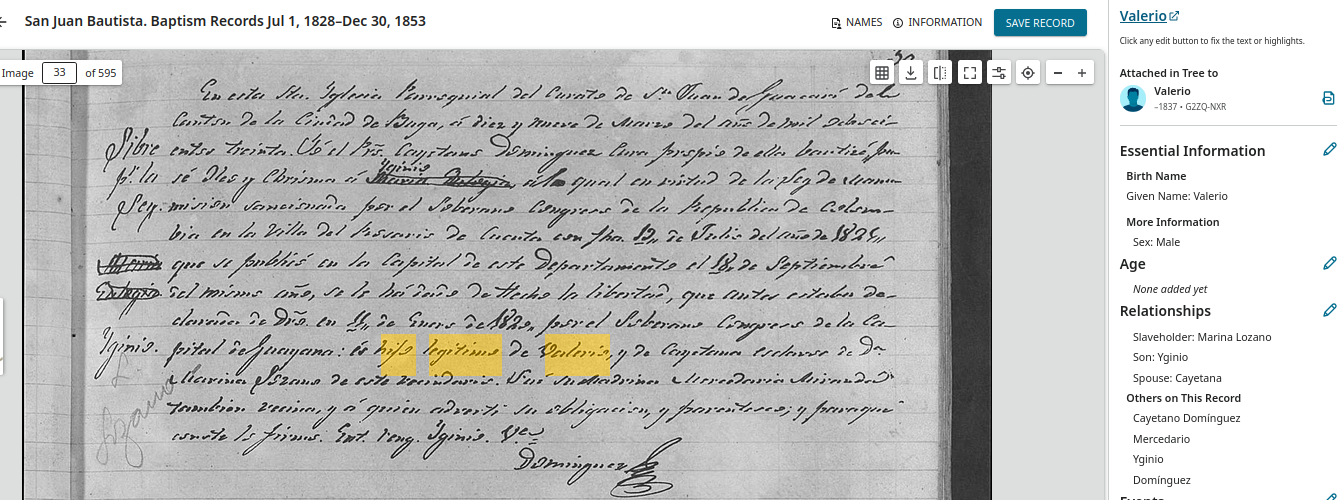 Notice how record is correct as coding Marina Lozano as the slaveholder of Valerio, and conversely, Valerio (and spouse Cayetana) being slaves of Marina Lozano.