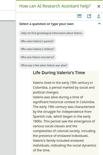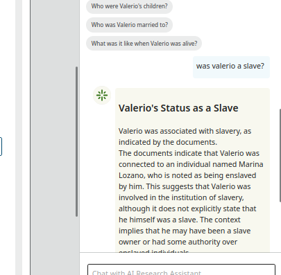 However, when asking about Valerio's life, the Chatbot gives a vague answer about slavery.