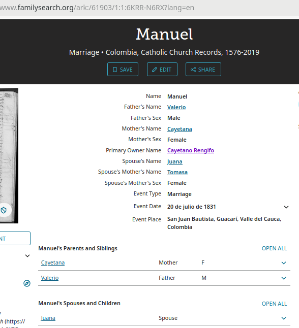 (Documentary evidence: "San Juan Bautista, Guacarí, Valle del Cauca, Colombia records," images, FamilySearch (https://www.familysearch.org/ark:/61903/3:1:3QSQ-G9VH-YNY3?view=explore : Jul 12, 2025), image 134 of 393; Archivo Diocesano de Buga (Colombia).