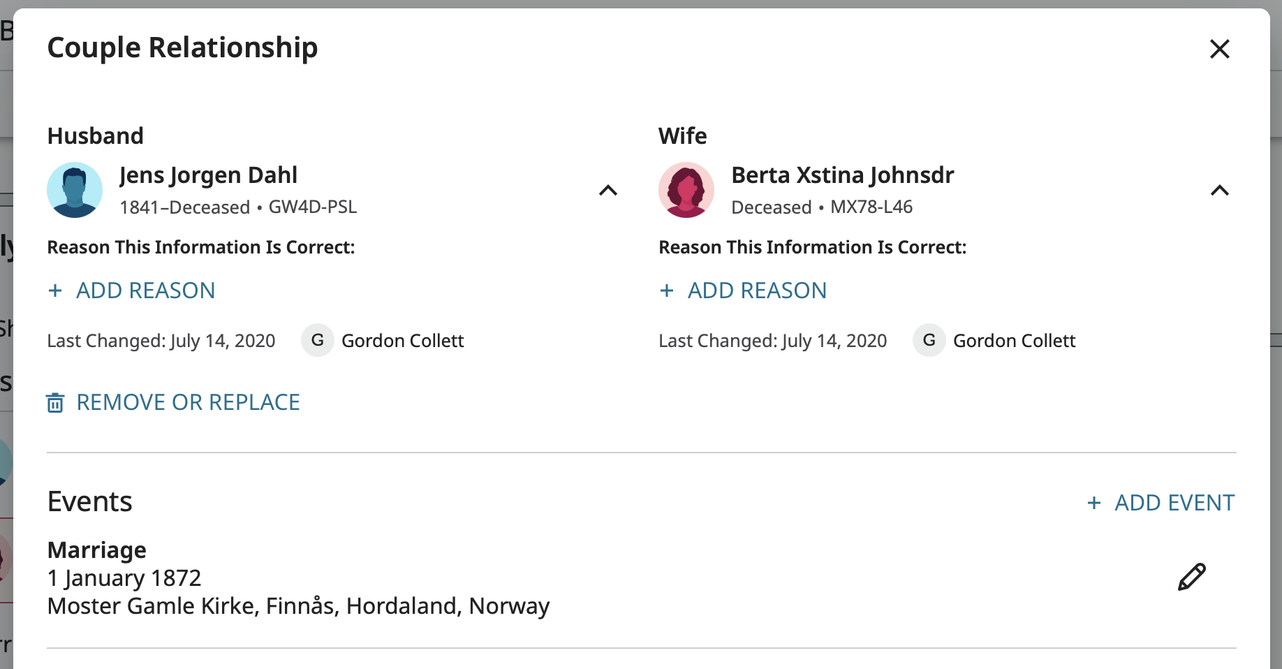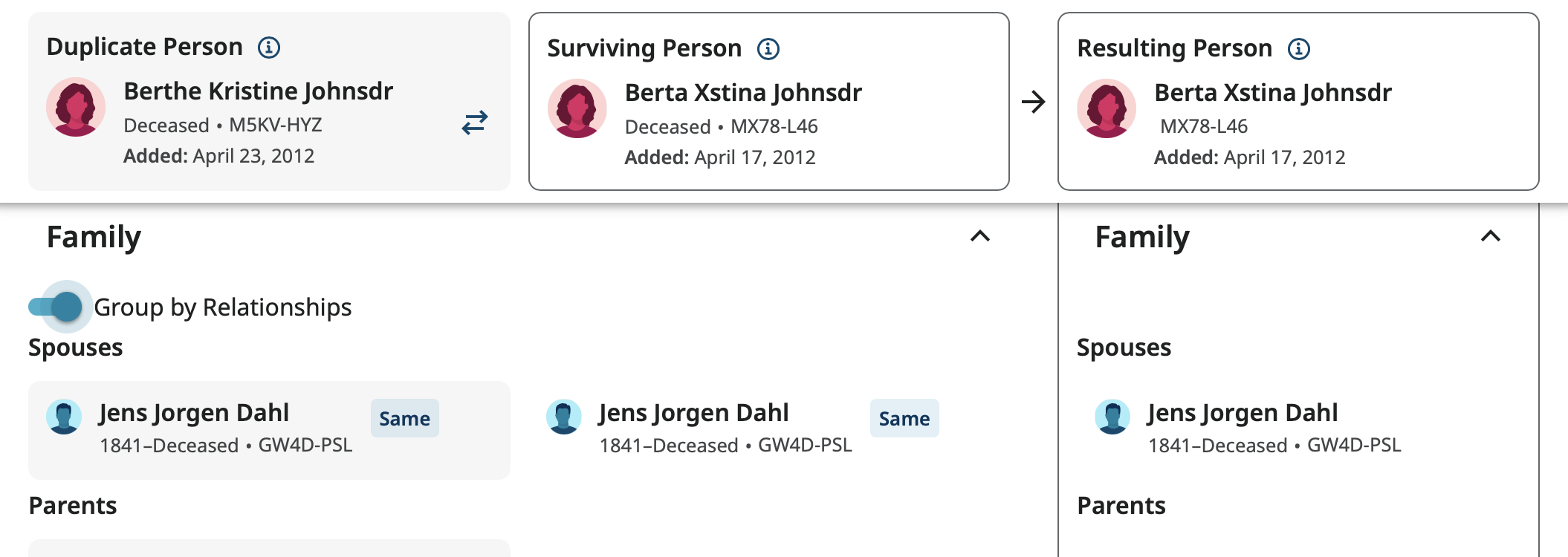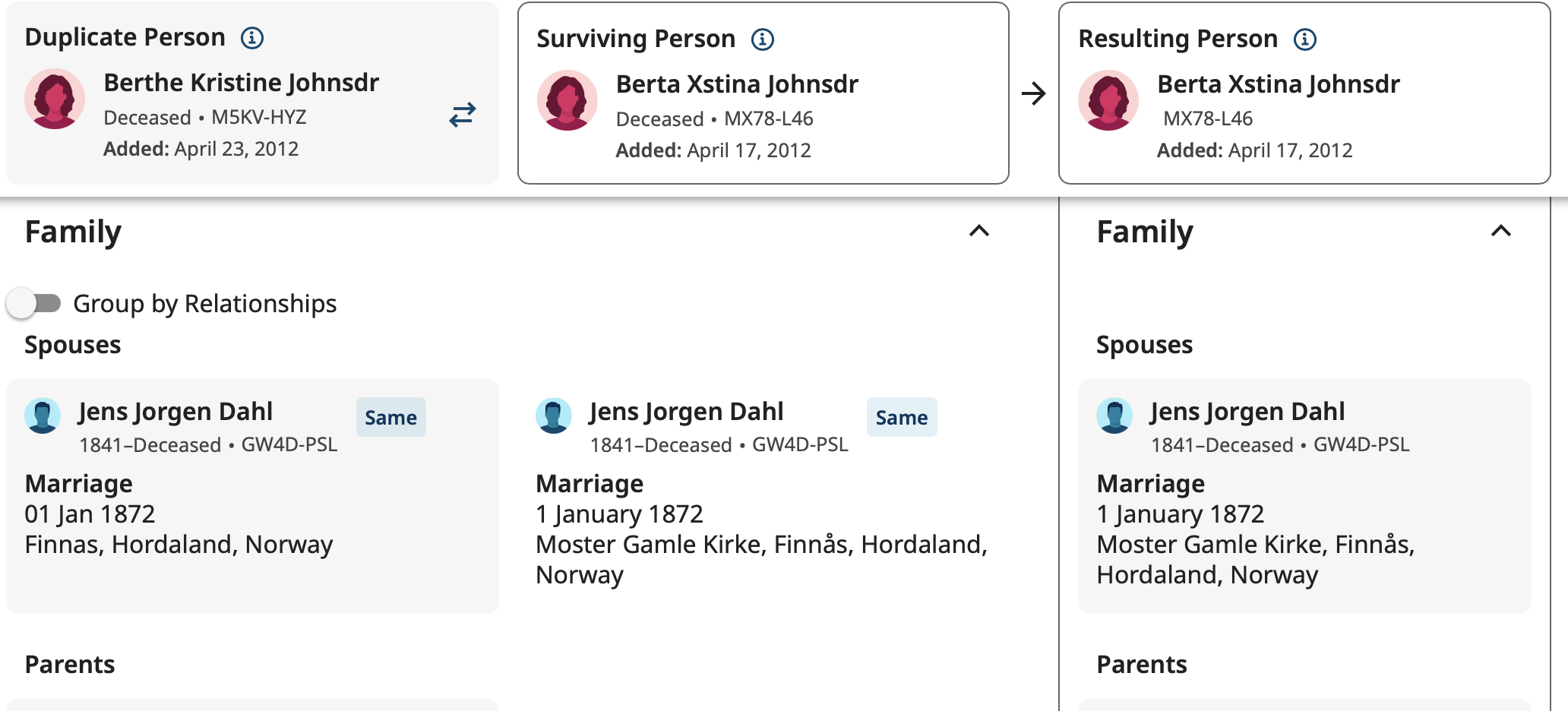We need to be able to see the marriage information whether Group by Family is on or off. We need to be able to choose which marriage information to keep or if there is something about the underlying data structure that is going to make that impossible, all marriage events need to be copied to the surviving profile. It is much more efficient to open the Couple Event box after a merge and delete unneeded or duplicate marriage events than to have to search around to find the lost information and copy it to the surviving profile.