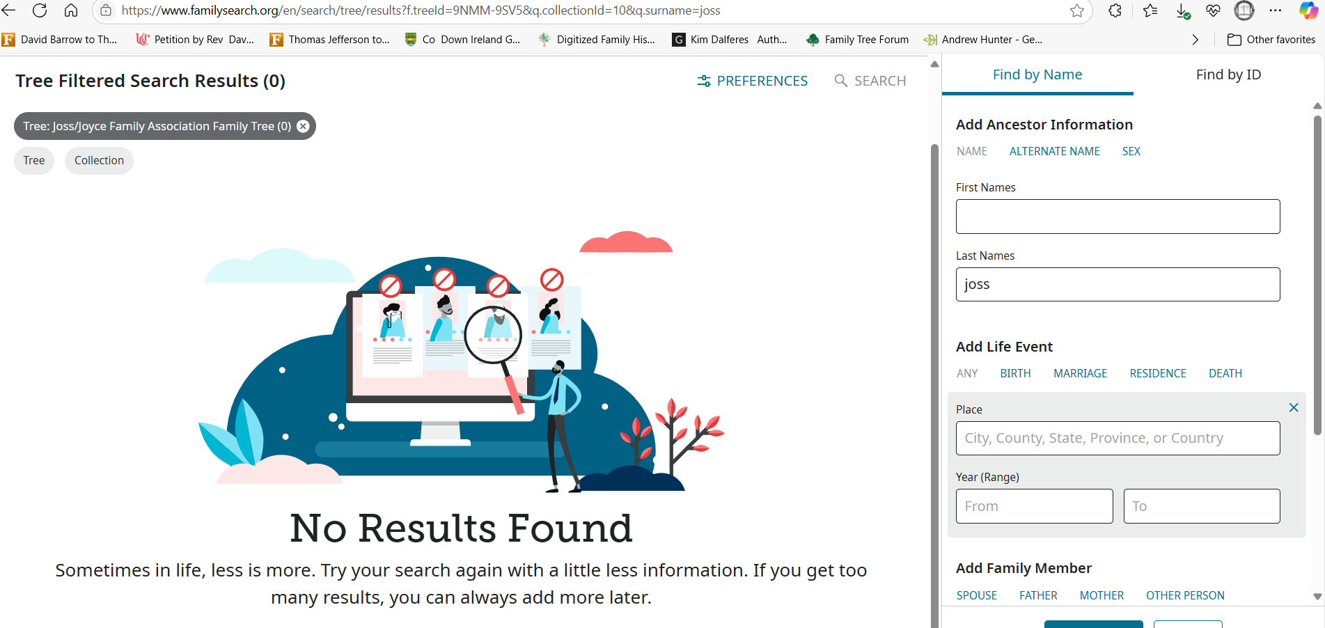 I attempted to use the "find" feature in my family tree, but it is showing no results. I have over 13,000 people in the tree. What am I doing wrong? My browser is Bing.