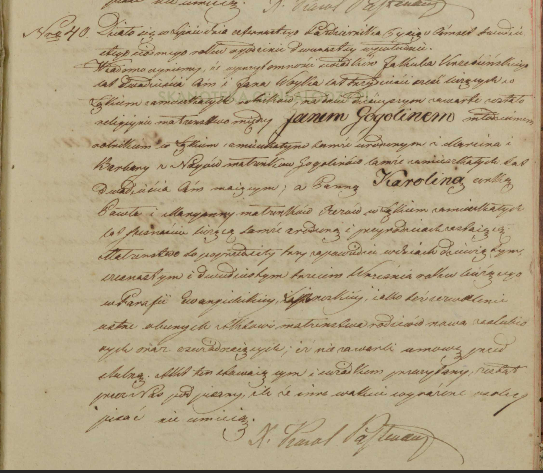 Would you kindly translate the marriage record of Jan Gogolin, son Marcin Gogolin and Barbara Naga, and Karolina Reza, daughter of Paul Reza and Marianna. Record number 40, Year 1827, Parish Lipno (Evangelical). Thank you!!!!
