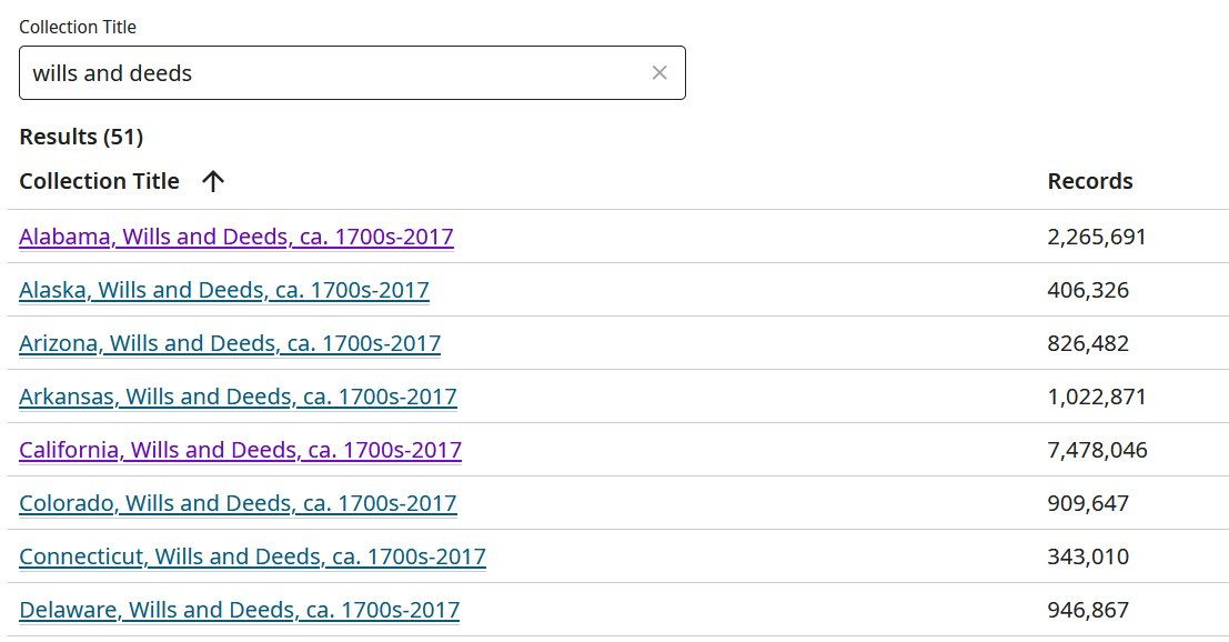 When browsing thru the Full Text Search Collections I noticed that certain 'Wills and Deeds' start with the State Name. For example, 'Alabama, Wills and Deeds, Ca. 1700-2017' which [for consistency] should probably be written 'United States, Alabama, Wills and Deeds, Ca. 1700-2017. Same with the rest…