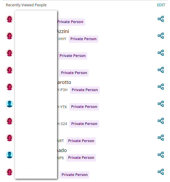 All the people that are on my Recents list are displaying as Private Person today. This is for both the drop-down list of Recents and the full page version. It includes profiles that I have visited but not modified.