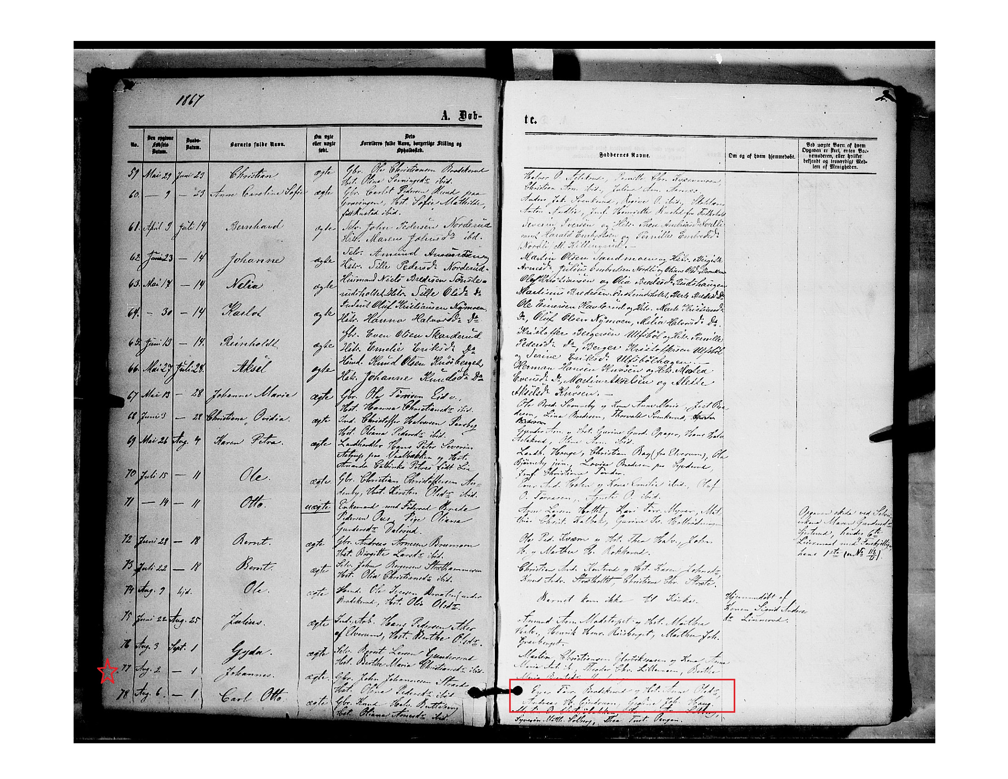 the names of the witnesses to Johannes Johnsen's baptism (line 77), son of John Johannesen and Oline Pedersdtr Strand, 2 August 1867.