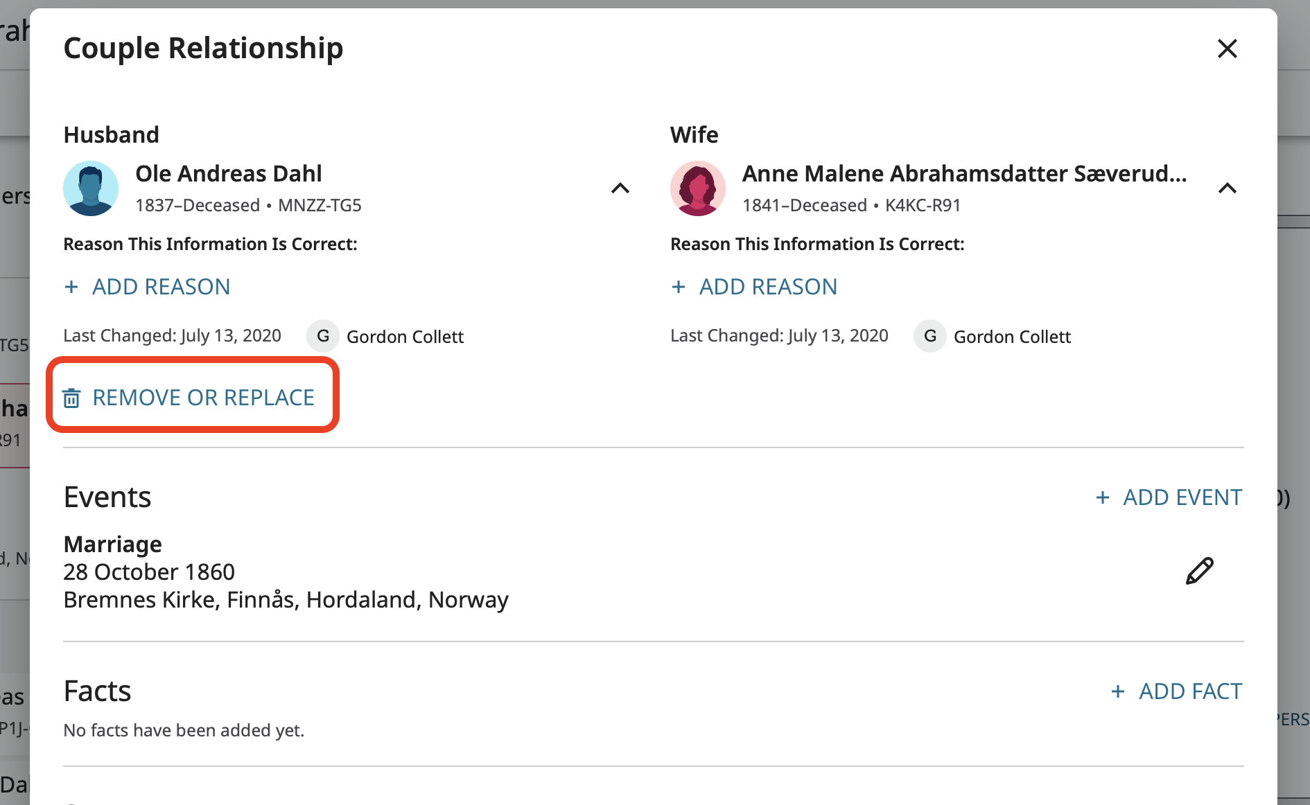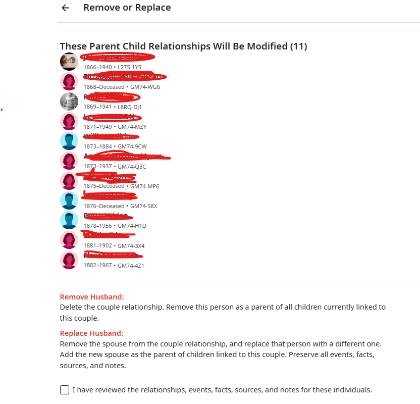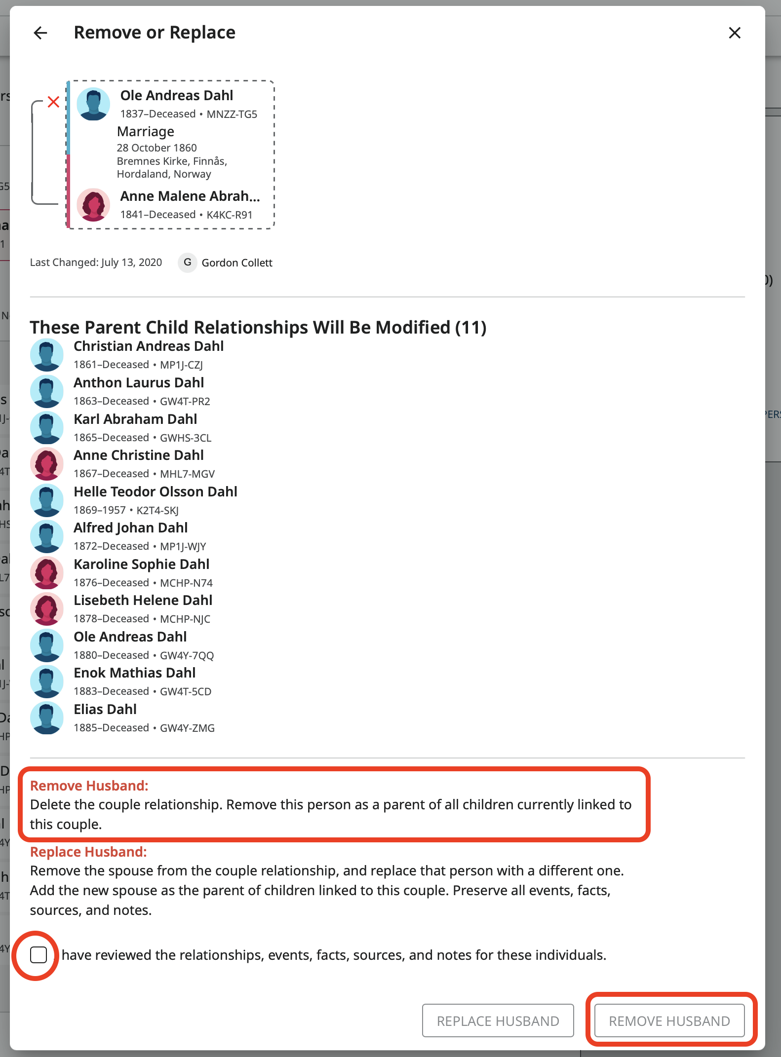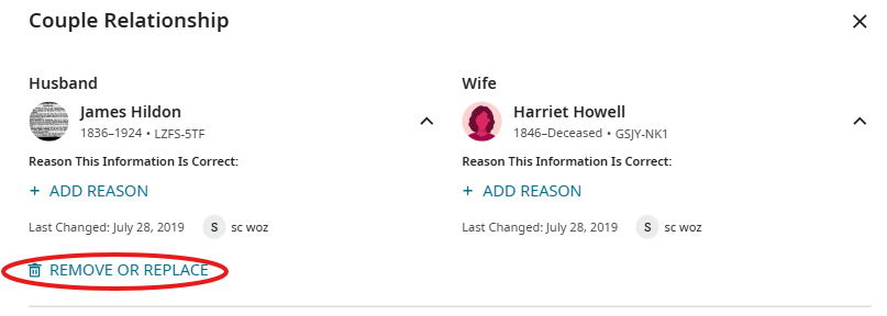 You will want to be sure the Remove Or Replace is under your father. That is why you need to start from the other man's profile.
