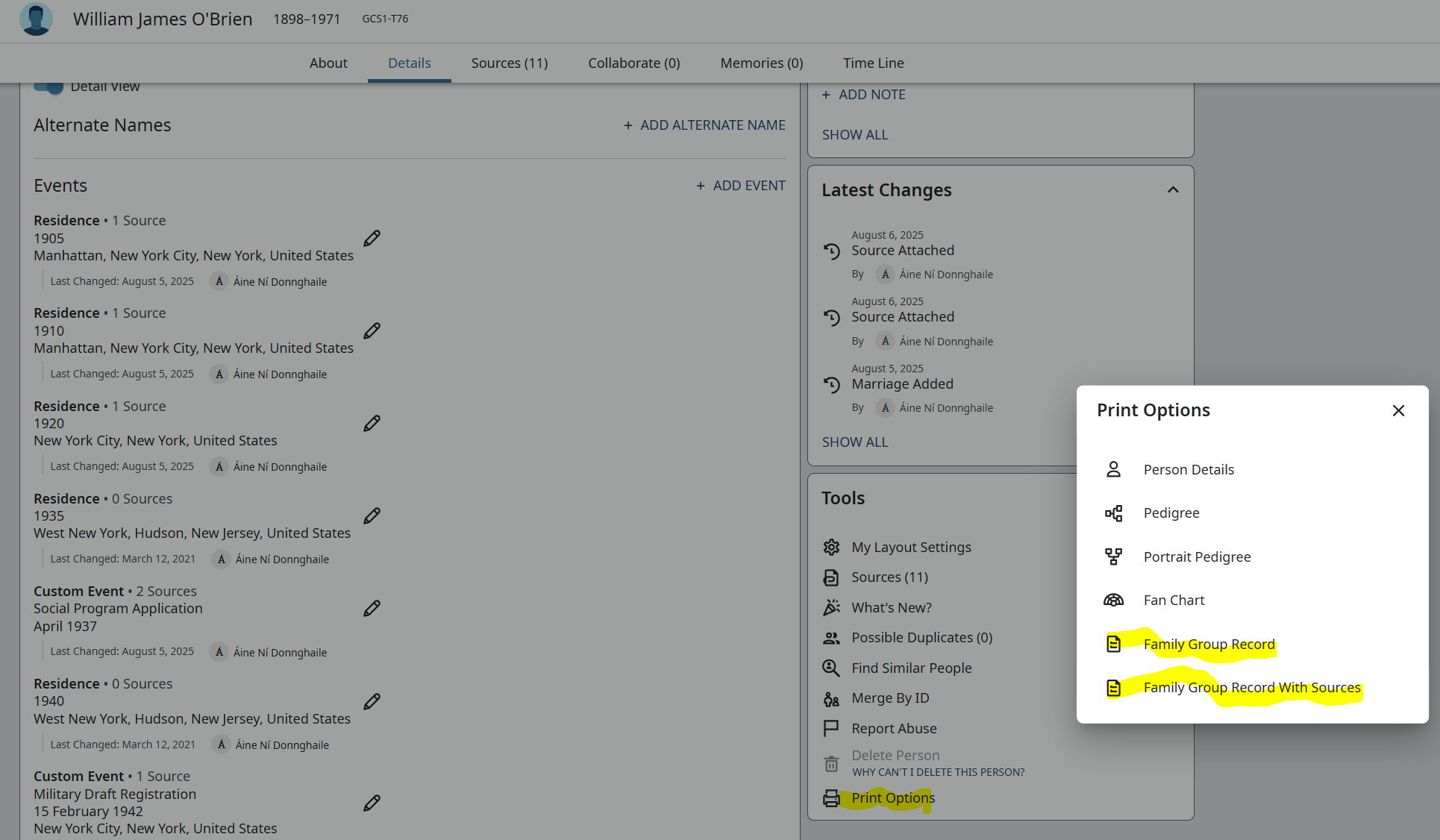 From the Tools box on the right side, select Print Options, then Family Group Record, with or without sources.