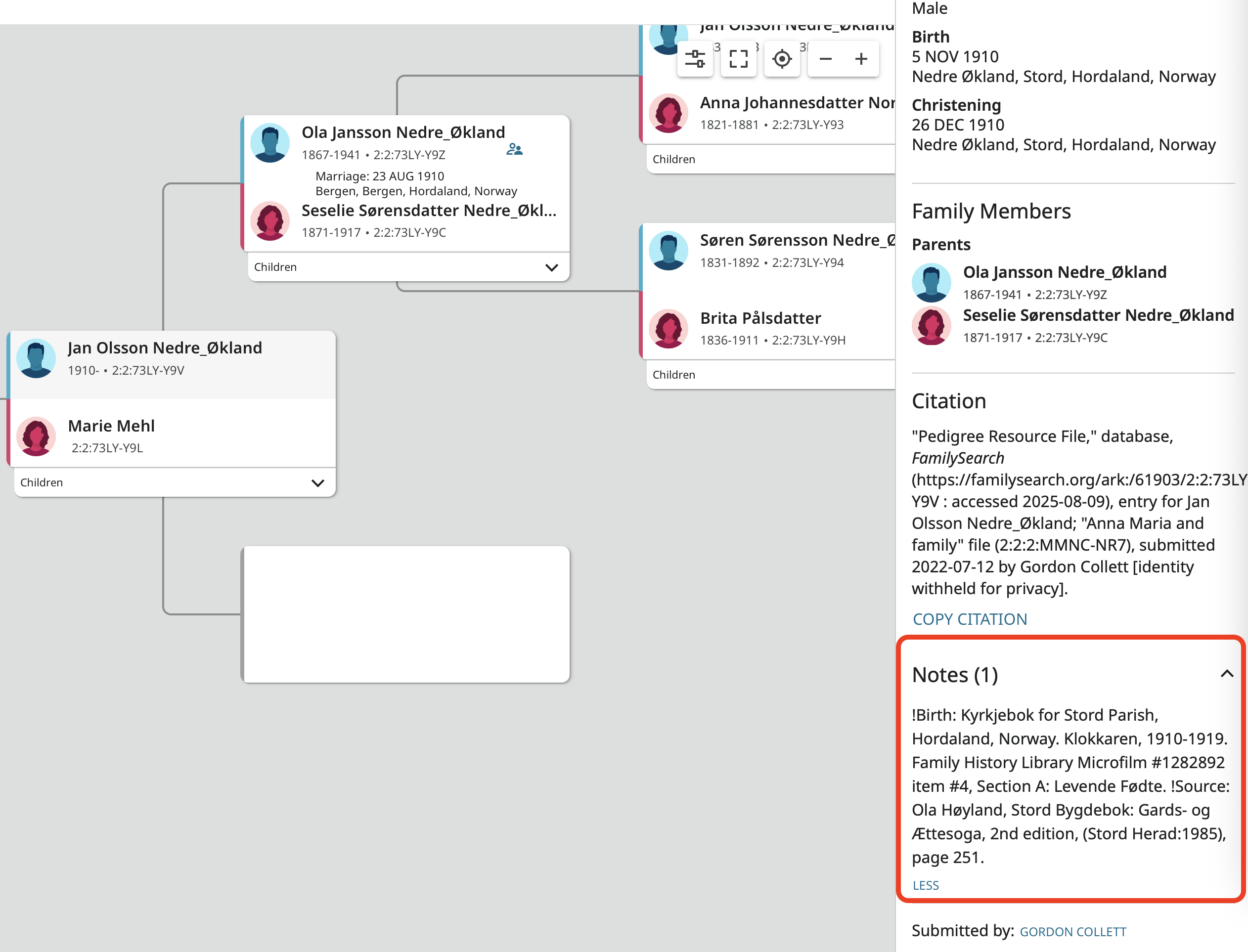 This looks like the landscape pedigree in Family Tree but it is not. There is no detail page to jump to. The side panel is permanently open and it contains everything from the imported GEDCOM file along with a generated citation. The important part here is that there was a note in the GEDCOM which contains two sources illustrating the fact that notes (and sources) are not transferred from the Pedigree Resource File created from the GEDCOM file to Family Tree when the PRF information is imported to Family Tree.