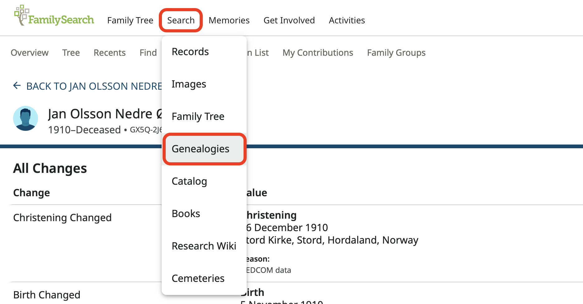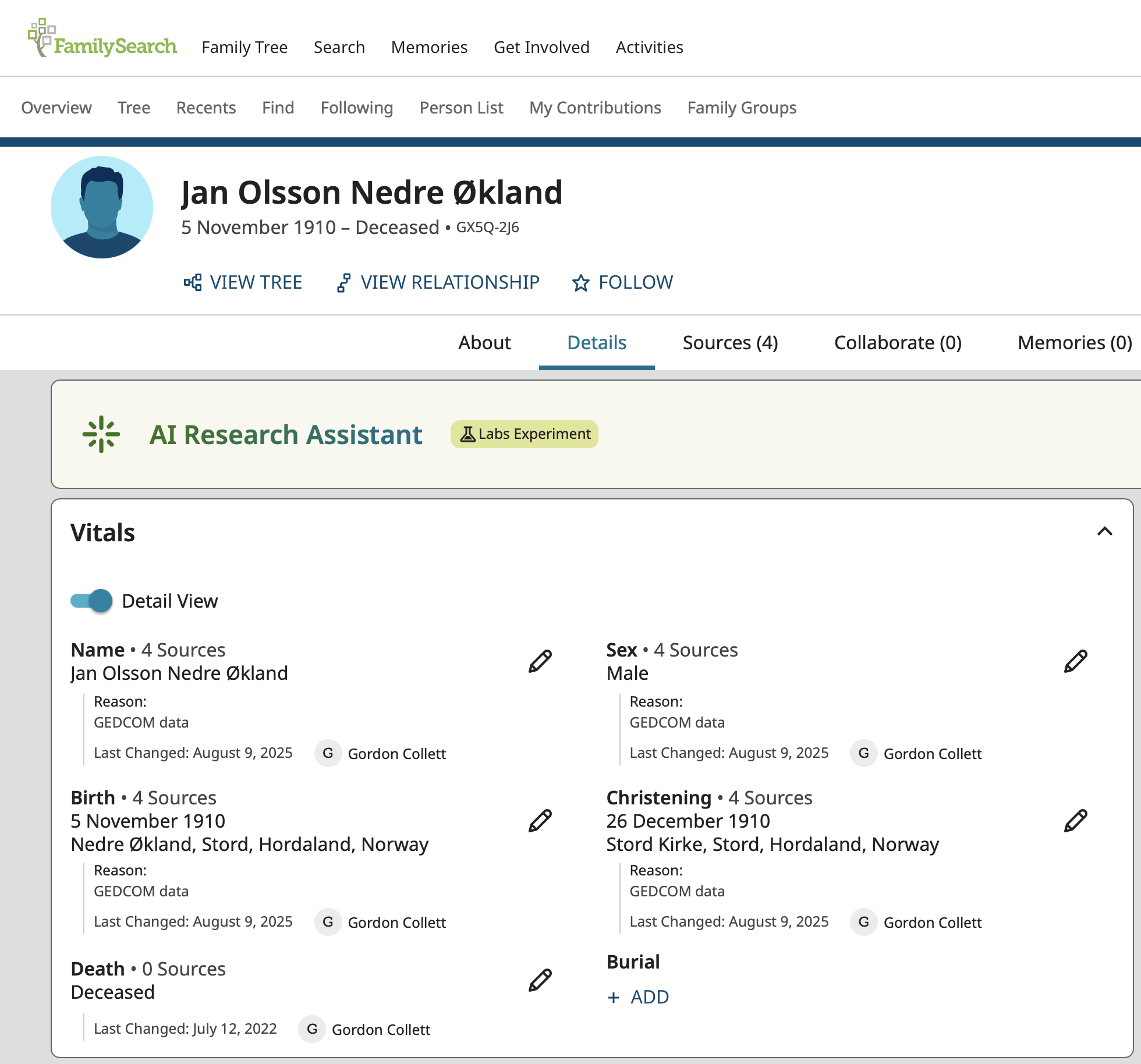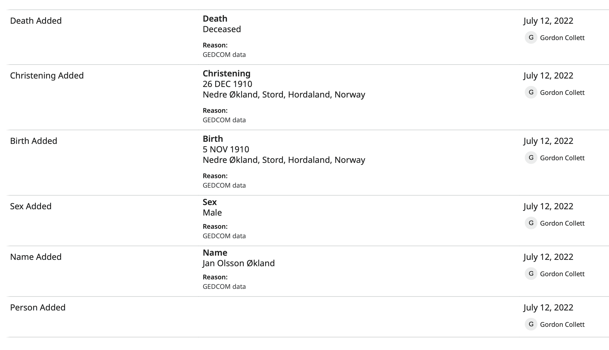 As previously stated, Reason: GEDCOM data is automatically added everywhere the user does not enter a reason statement during the import. Since this declaration means the information came from a GEDCOM file, this will be shown in the Change Log. It might have been imported to create this profile or might have been used to created a profile that was merged into this one. In either case, the next step is to go to the Change Log and look for the reason statement. This works far better in the old Change Log. The new Change Log hides the initial creation of the profile.