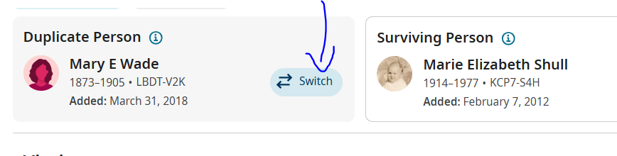 I did not see a 'switch' option but needed one as the marriage information that was in the left hand profile (duplicate person) and not the surviving person did not populate to the result (see separate discussion).