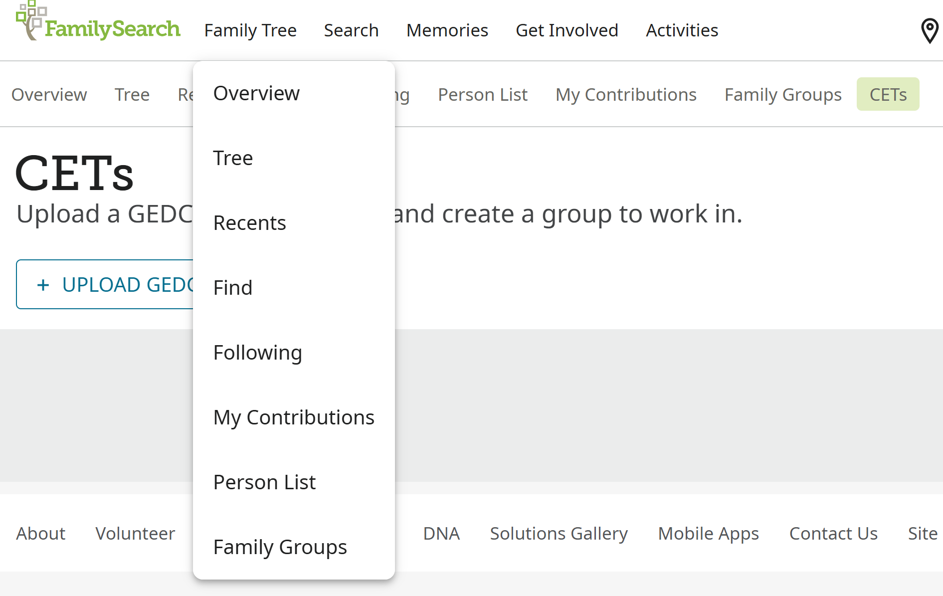 1. If you click the Family Tree option in the menu, do you see the option for CETs at the bottom?2. If you click on Search option in the menu, then Genealogies, then Upload your Individual Tree, do you see your upload there?