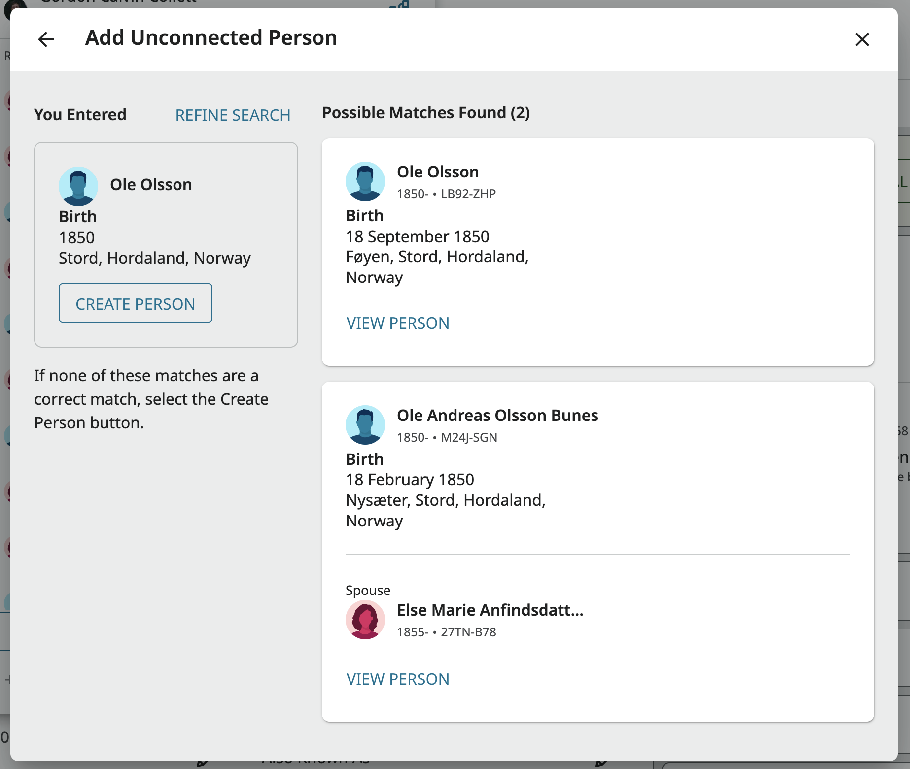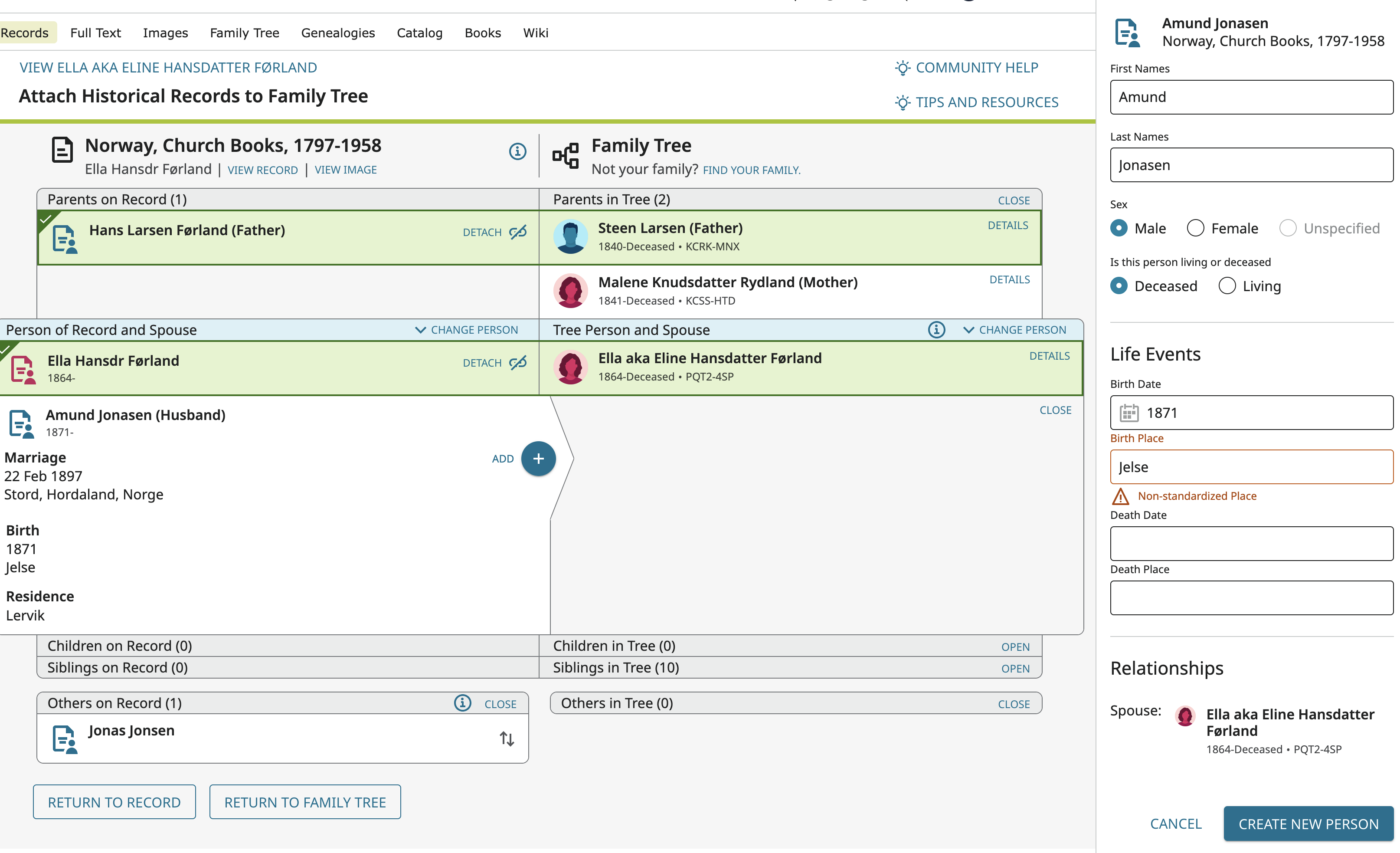 However, because the record is not associated with anyone, I cannot change the focus person right now and have to select Steen Larsen then fiddle around and get him to match up with "Hans."