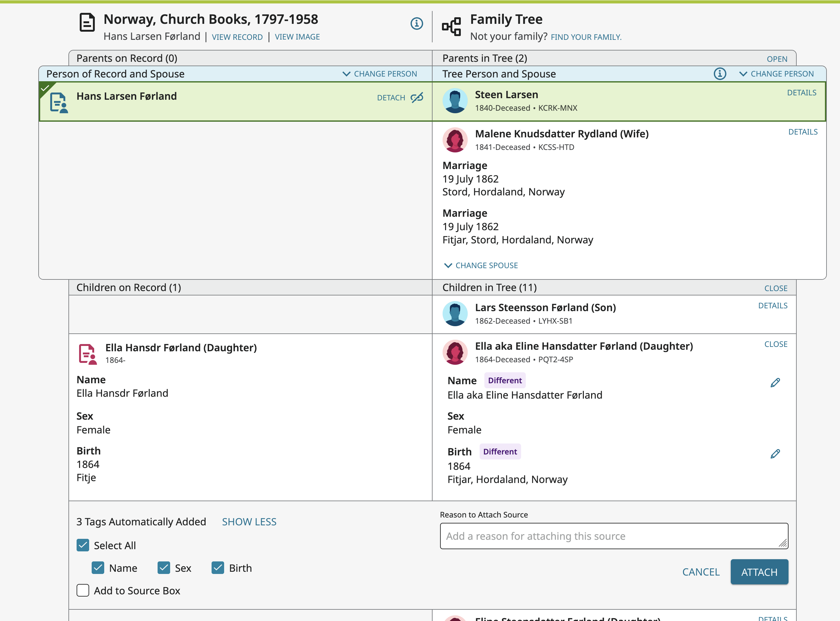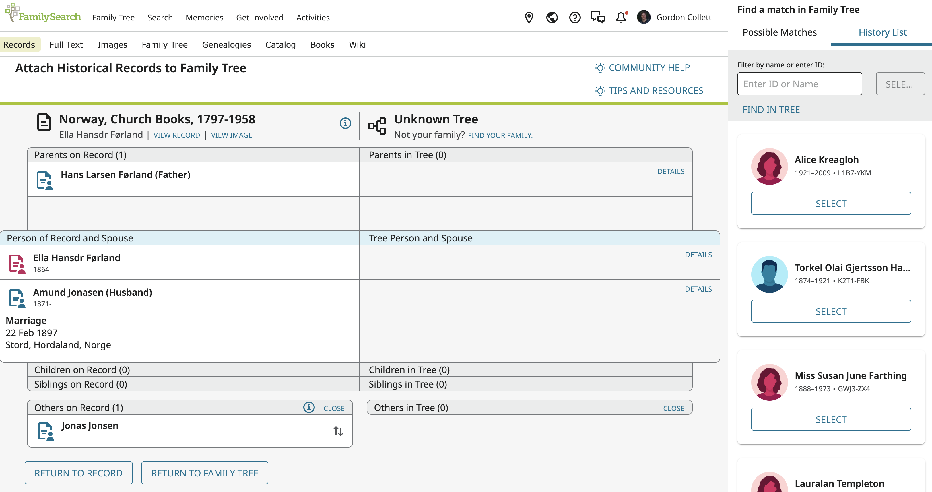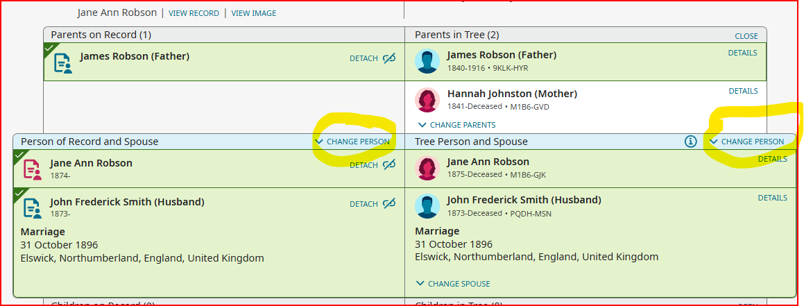 If I try to attach the record when the page is focused on Jane Ann using the button 'Attach to Tree' there is no obvious way to find her entry in the righthand pane (unless I've copied the ID number ahead of time and paste it in) although the correct father (James Robson, ID: 9KLK-HYR) is given in the righthand pane on the 'My History' tab.
