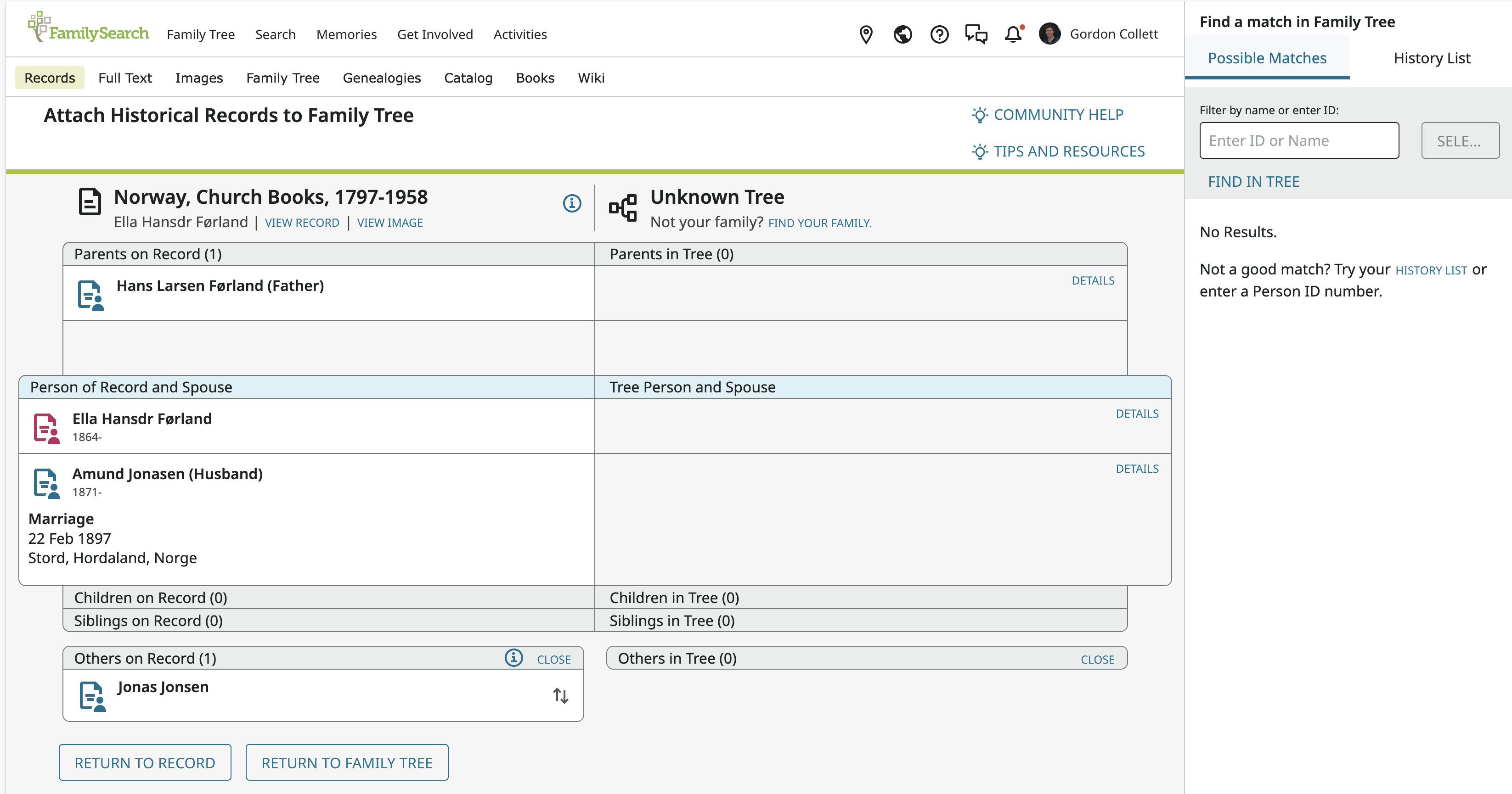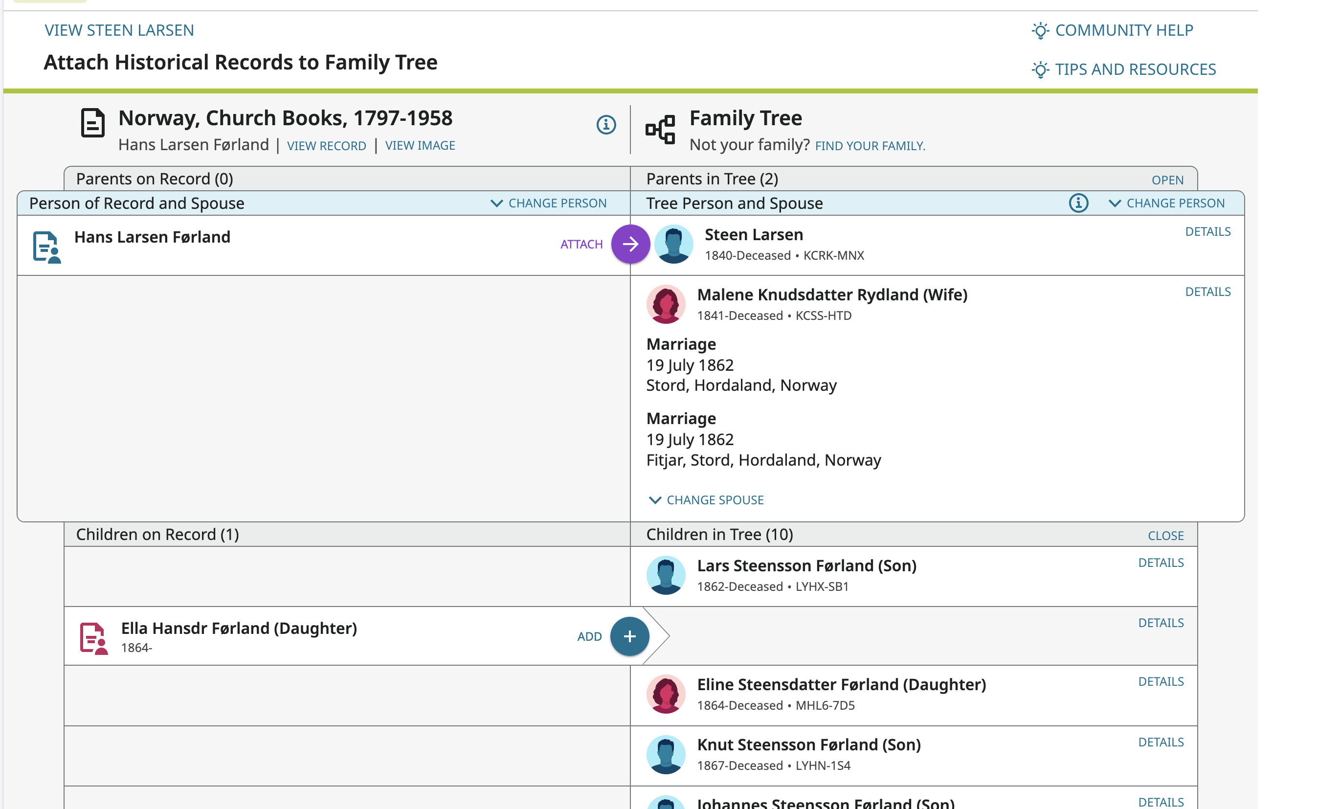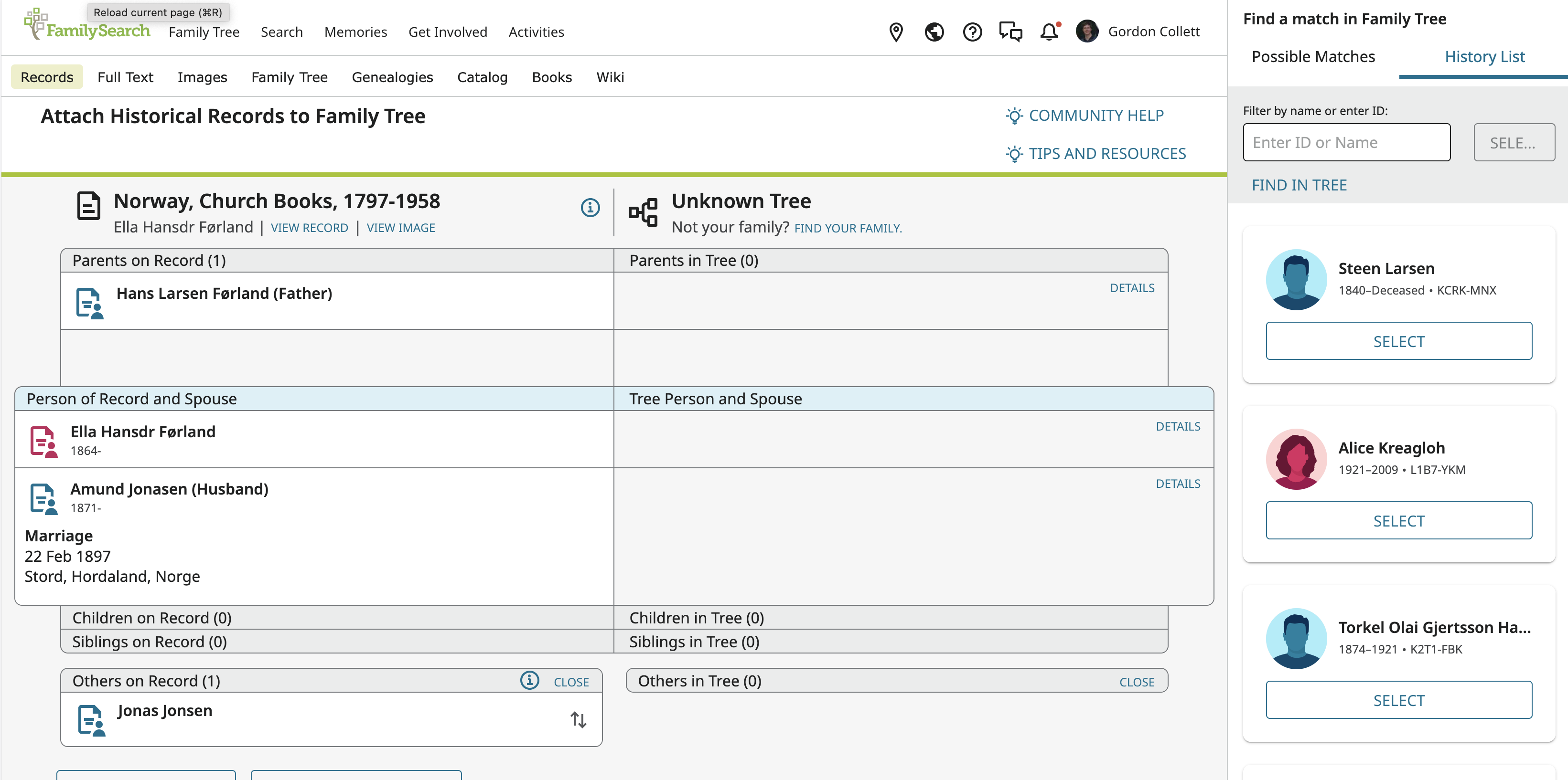 If I try to attach the record when the page is focused on Jane Ann using the button 'Attach to Tree' there is no obvious way to find her entry in the righthand pane (unless I've copied the ID number ahead of time and paste it in) although the correct father (James Robson, ID: 9KLK-HYR) is given in the righthand pane on the 'My History' tab.