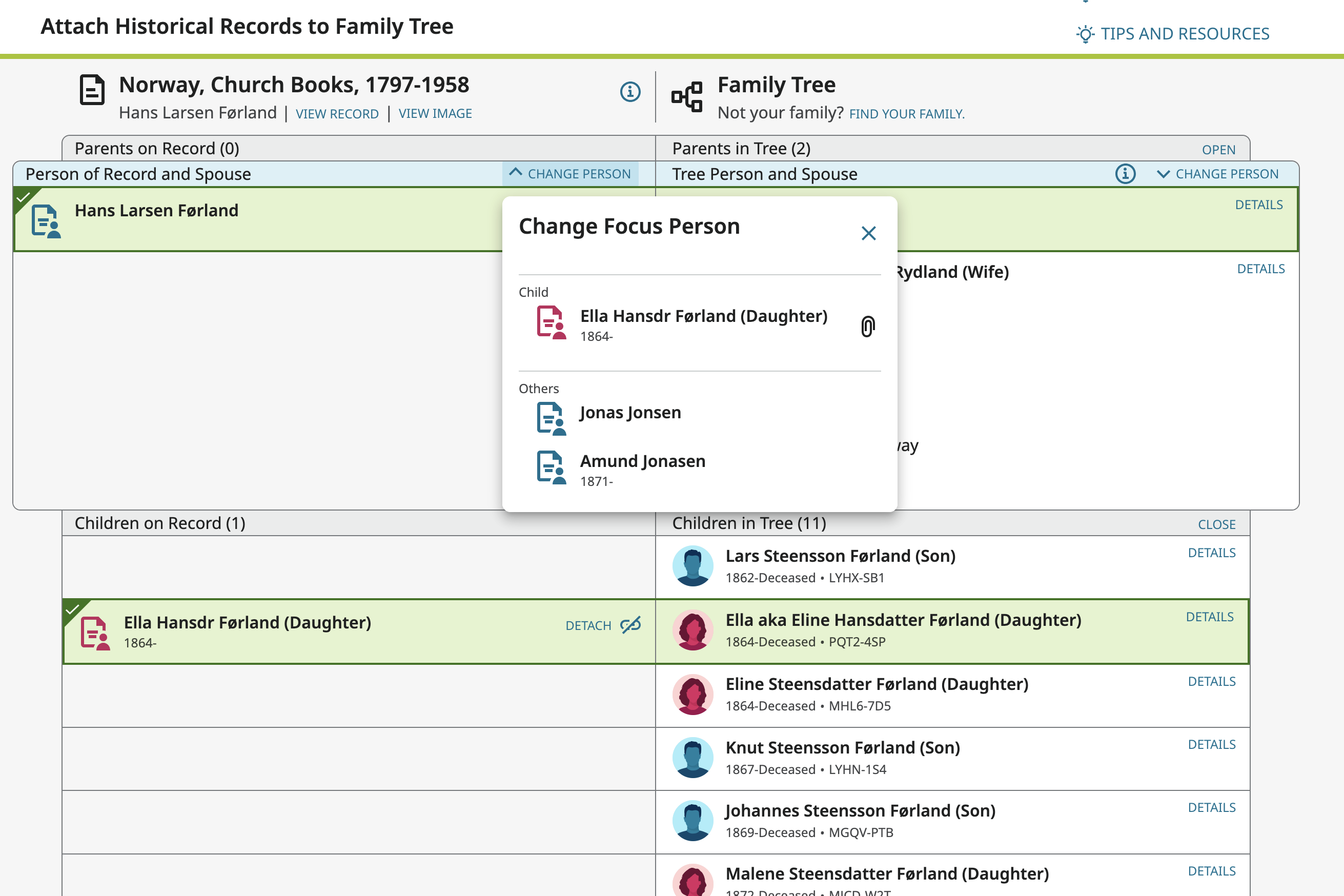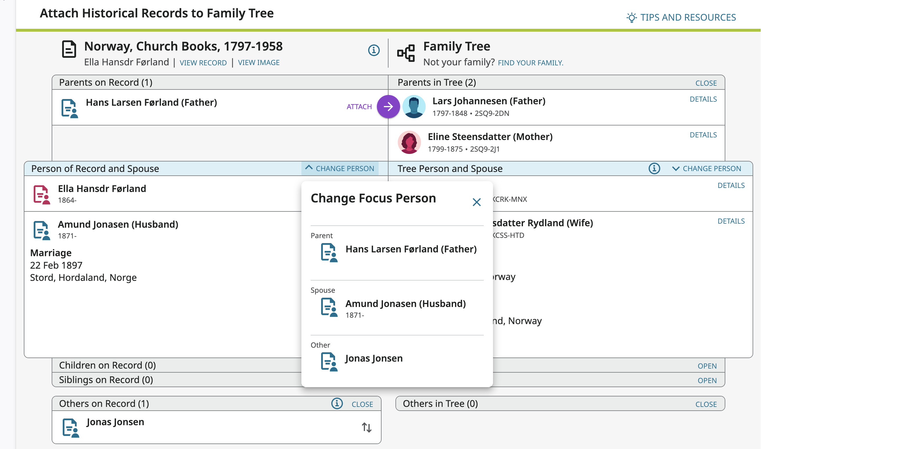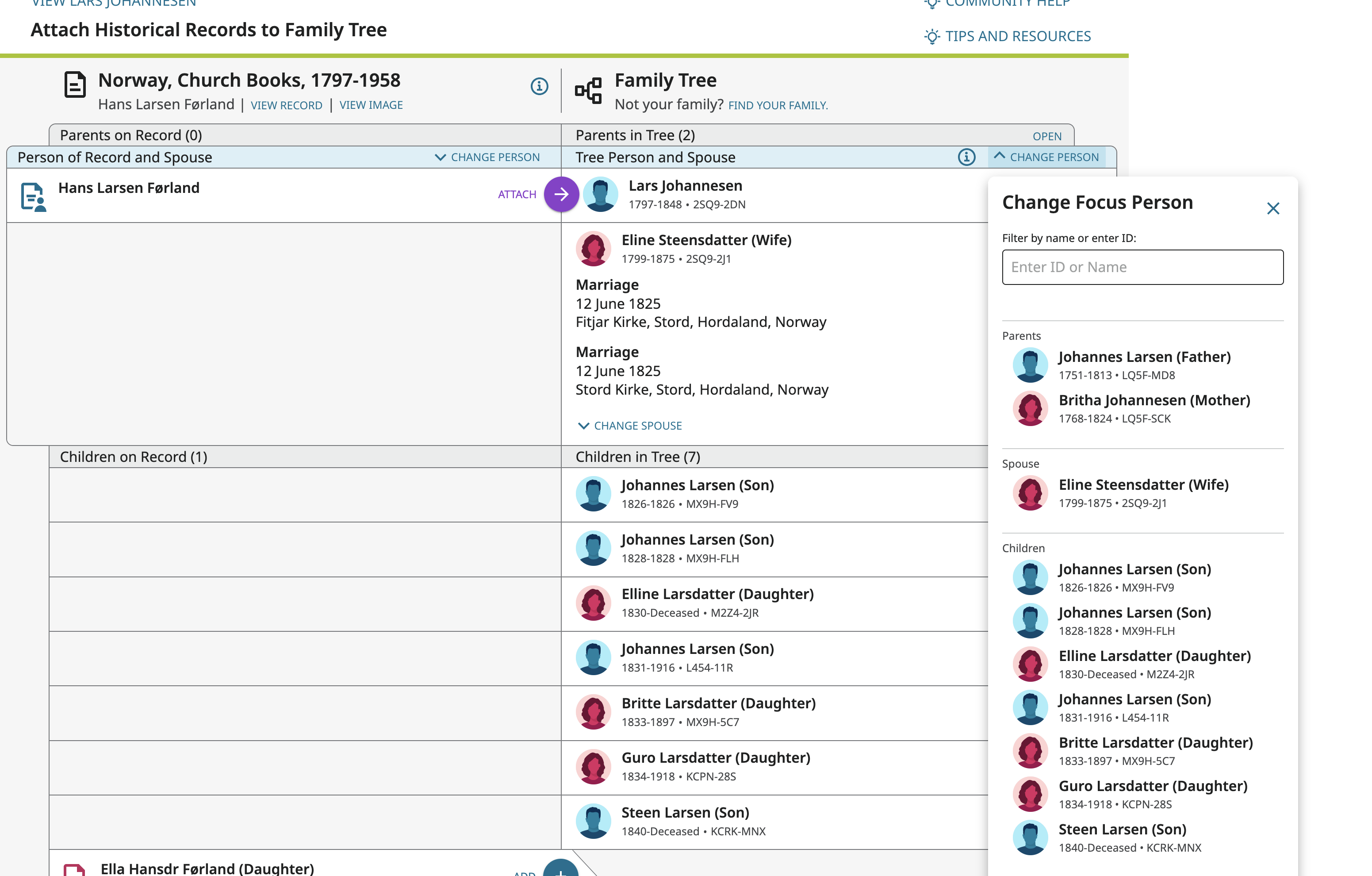 @FrankLittle when you were attaching the source were you looking at this page? If so, you can change the focus person by clicking on "change person" and choosing another person.