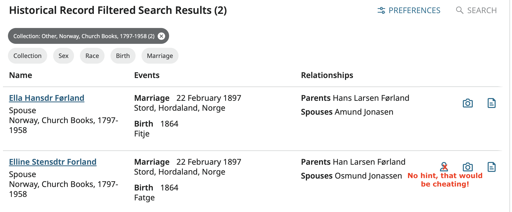 Here is the first road block you mention. The program as no idea who Ella, as the source has her name, is. If it did, one of those little head outlines would have appeared on the index record such on on the other source for the marriage record where her name is indexed correctly. And there would be a hint on her profile page.
