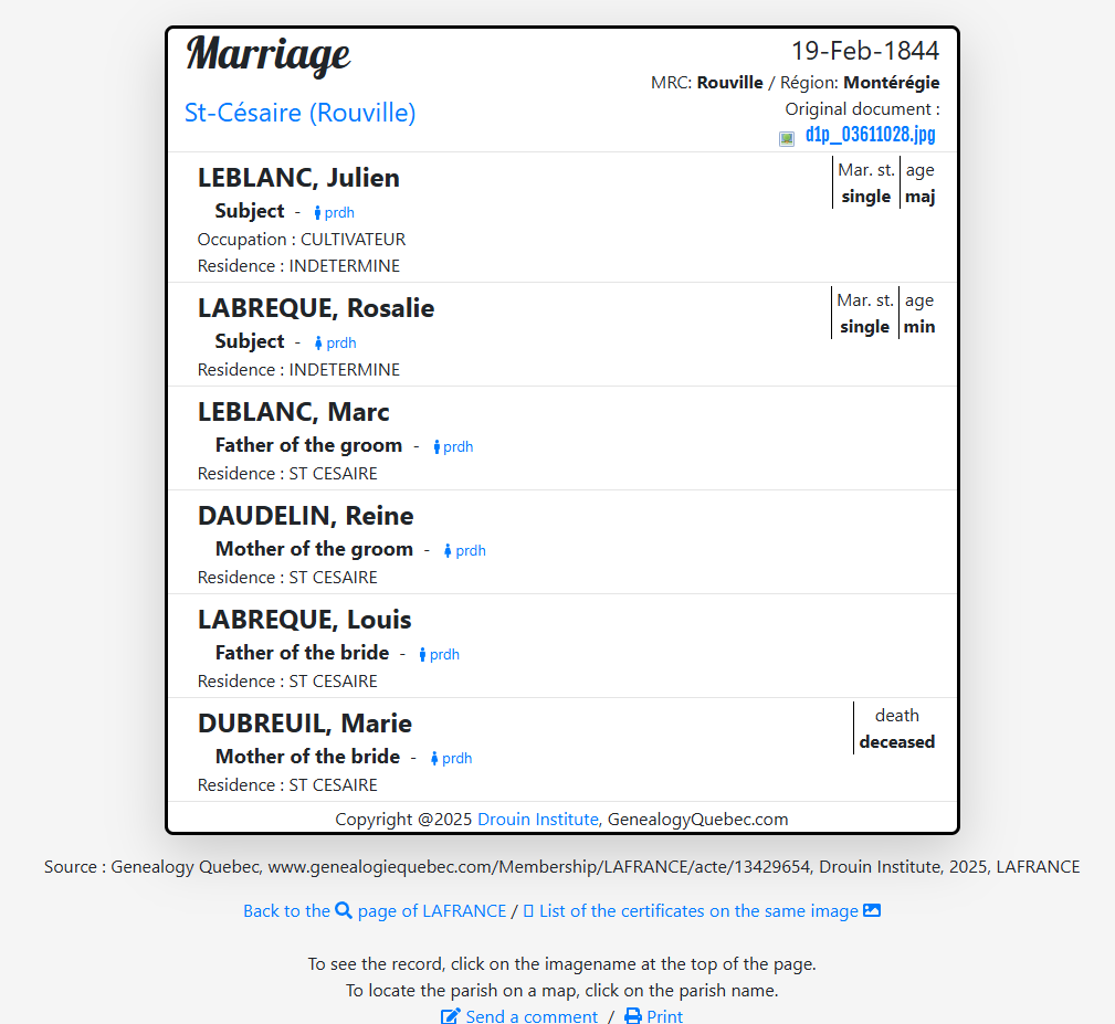 Here is the indexed version (translated) from Drouin Institute. I also note that (1) they had a good number of children, and (2) in most of the children's baptism records, he went by Marc Leblanc instead of Julien. Further, I found that Marc Leblanc (who appears to have been called Julien in his marriage record) was born 30 may 1819, baptized the same day in St. Hyacinthe, son of Marc LeBlanc and Marie Reine Daudelin.